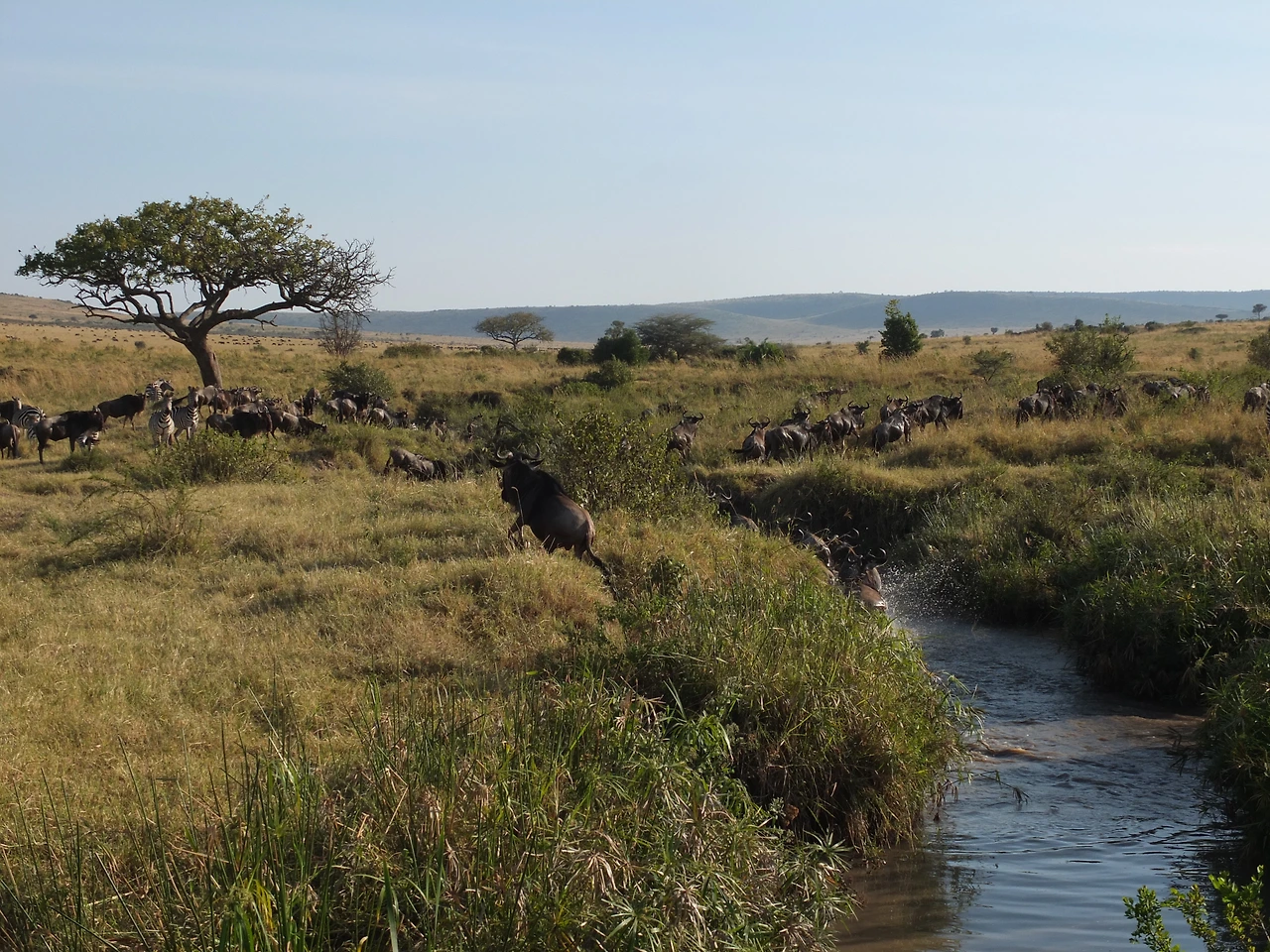 내가 마사이마라에 있던 7월은 건기의 시작이었다. 남쪽의 누 떼들이 물을 찾아 북쪽인 마사이마라로 이동하는 계절이다. 남쪽에는 더이상 푸른 풀과 물이 없기 때문이다. 우리는 여기저기서 수백 마리의 누 떼가 허겁지겁 물가로 뛰어드는 장면을 목격했다. 와중에도 얼룩말은 꼿꼿이 고개를 들고 괴상한 철붙이에 타고있는 우리를 경계했다.