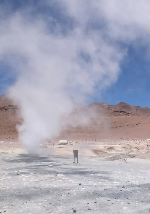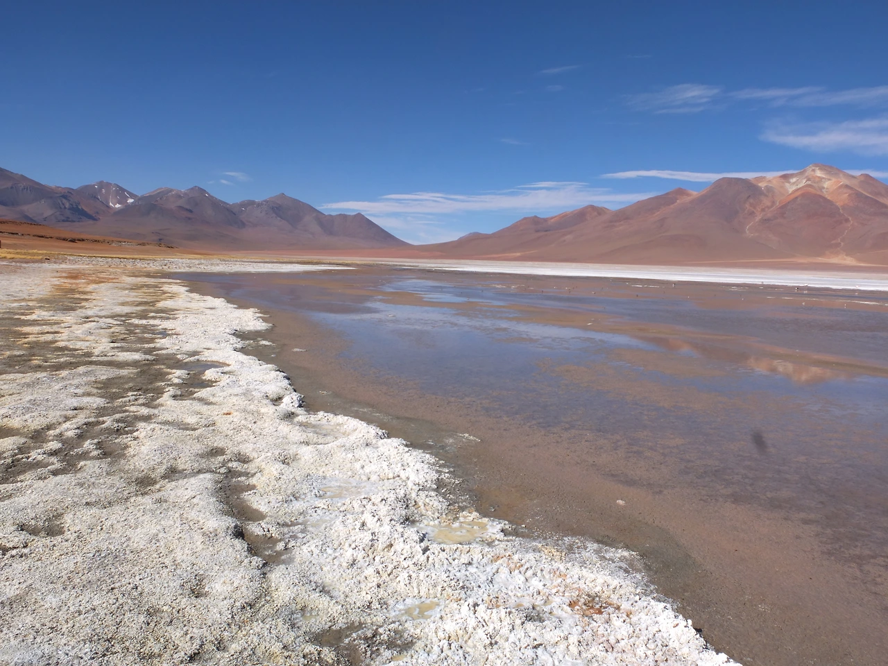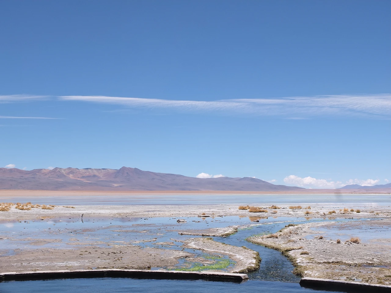 처음 멈춘 곳은 땅 한가운데서 온천이 솟아나는 곳이었다. 나지막한 언덕아래에 있는 고인 물에 엄청난 태양 빛이 반사되어 신기루 같은 무지개가 뿜어져 나오고 있었다. '해발 5천미터에 왜 온천이?'라는 의문이 들었지만, 고인 물 위로 열기가 이글거리는 것이 보였다.