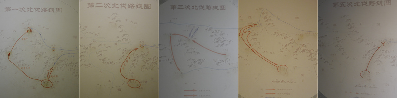 오장추풍(五丈秋風) 이라고 쓰여진 건물 안에는, 죽은 제갈량의 생애를 기리는 많은 자료들이 보관되어 있었는데, 그 중에서도 눈에 띄는 것은 1차부터 5차까지 이어진 제갈량의 북벌을 지도로 그린 그림이었다.