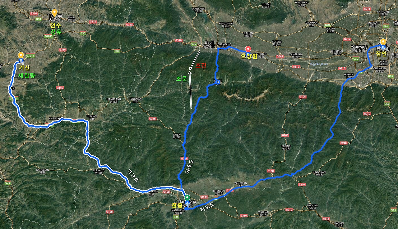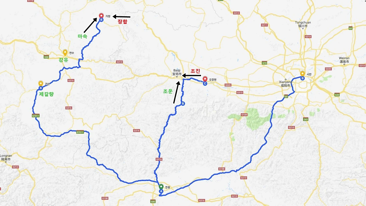 오장원은 그 중 마지막인 다섯번 째 북벌 때 촉의 군사들이 주둔했던 곳인데, 오늘 날 그 오장원을 찾는 일이 쉽지만은 않았다. 2천년이 지난 지금의 중국지도에 오장원(五丈原) 이라는 지명은 등장하지 않는다. 애초에 오장원은 도시나 성이 아니라 병사들이 주둔해 있던 고원지대를 가리키는 말이다.