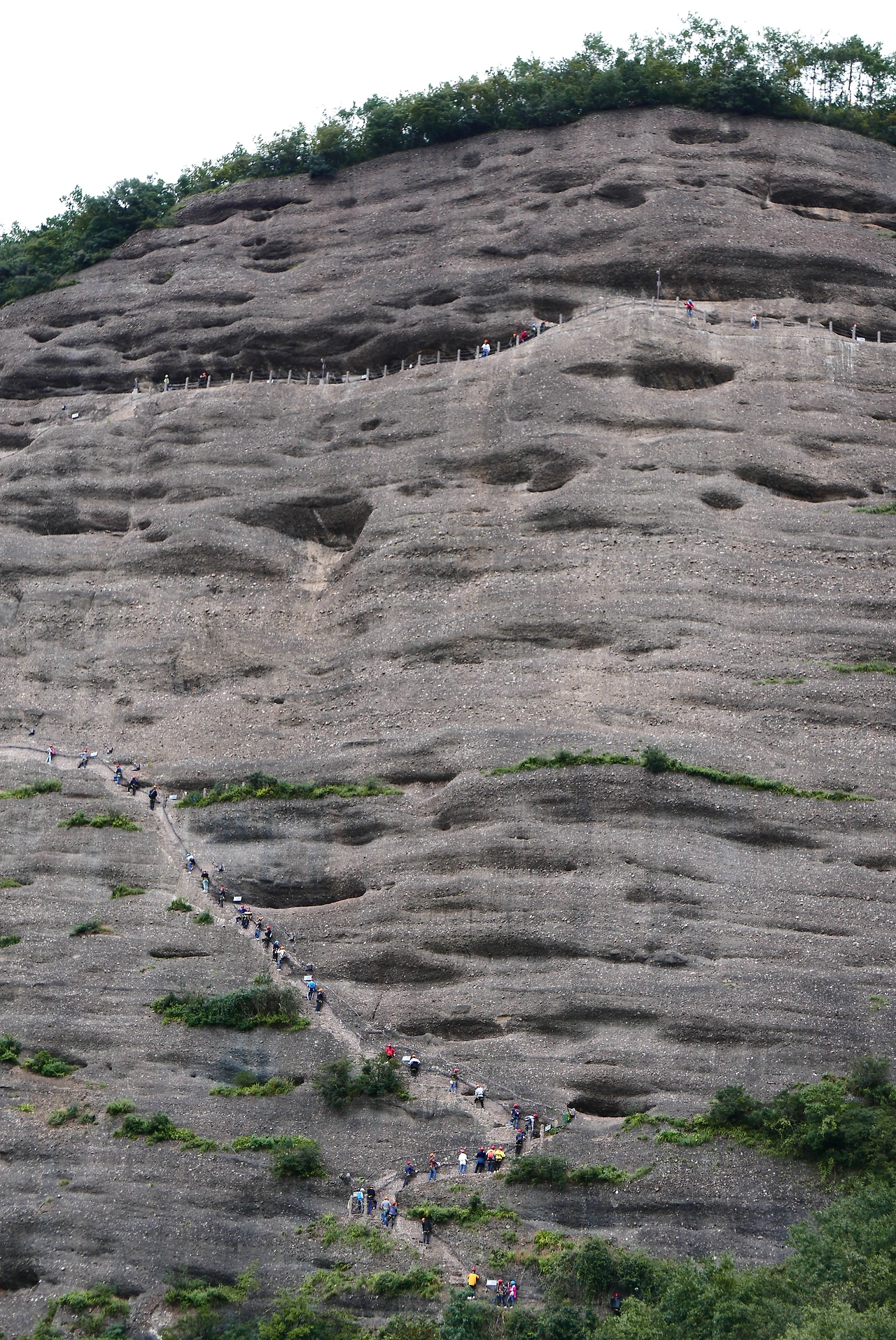 이것은 역사가 아니라 지금 눈앞에서 벌어지는 실화다. 사람들은 계단이라고 부르기에는 애매하고, 그저 수백년 간 방문객에 의해 군데군데 살짝 문드러진 바위틈에 발가락을 꽂아넣고, 한 손으로 힘껏 쇠줄을 잡아당기며 그 절벽을 기어 올랐다. 때때로 계단(?) 하나의 높이가 너무 높아 한번에 오르지 못할 때면 네 발로 기어서 클라이밍을 했다.