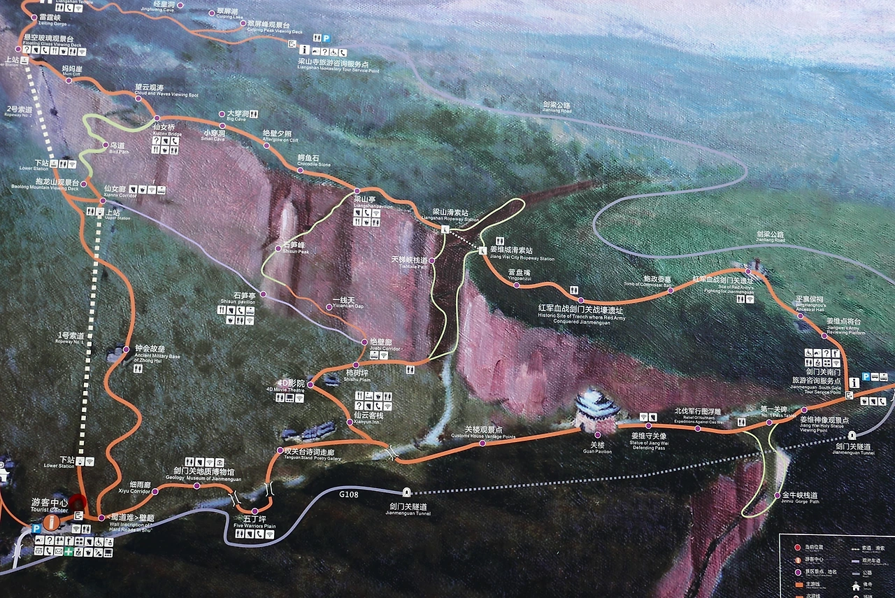 케이블 카는 나도 모르게 신음소리가 나올 정도로 가빠른 절벽을 따라 한참을 올랐다. 높은 곳에서 바라본 일대는 거대한 자연 장벽이 반원형으로 넓게 둘러쳐져 있어, 정말이지 그 가운데 어딘가에 있을 관문을 통하지 않고서는 도저히 촉나라 땅에 발을 들일 수 없는 모양새였다. 연의에서는 장비가 마초와 결투를 벌여 그를 물리친 뒤, 당시 이곳에서 건설중이던 검문관을 보고나서 제갈량의 안목에 혀를 내두르는 장면이 나오는데, 과연 제갈량은 틀림없는 천재다.