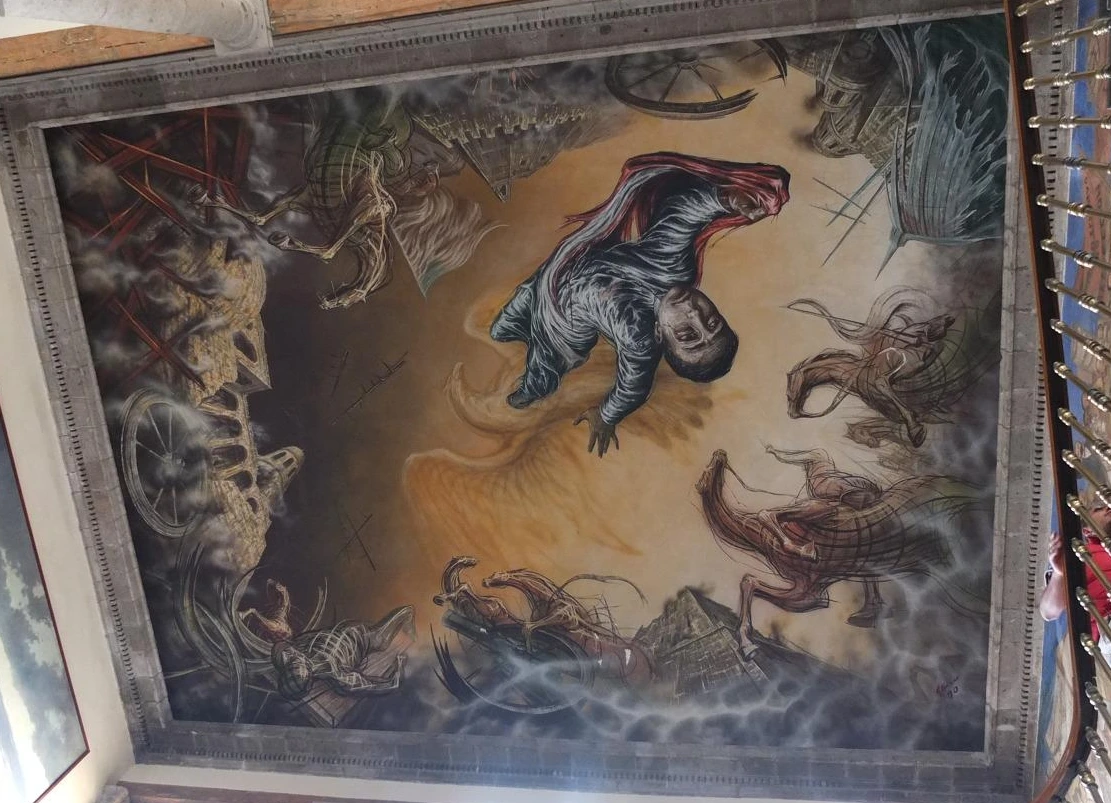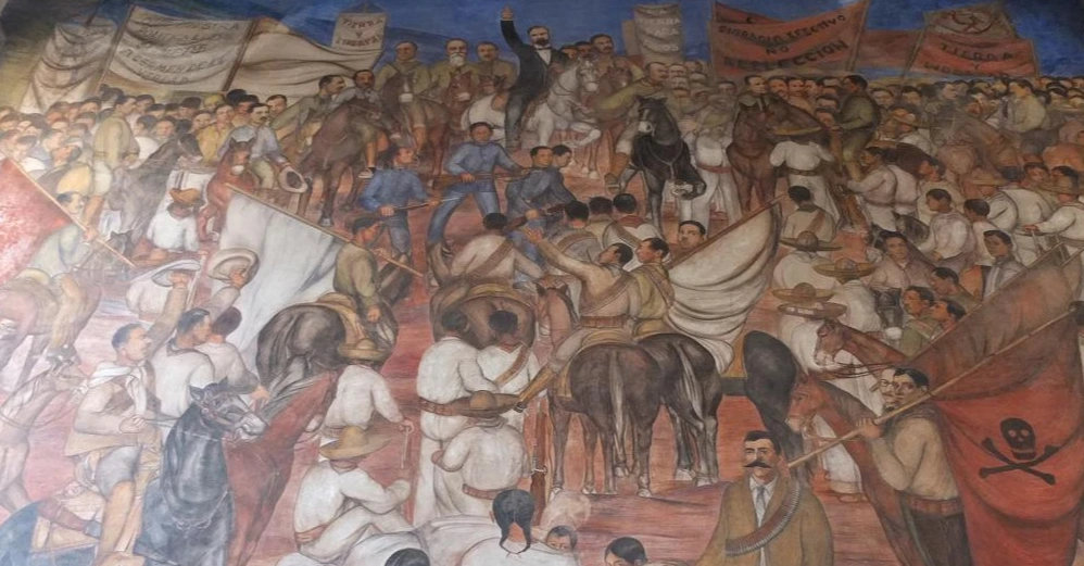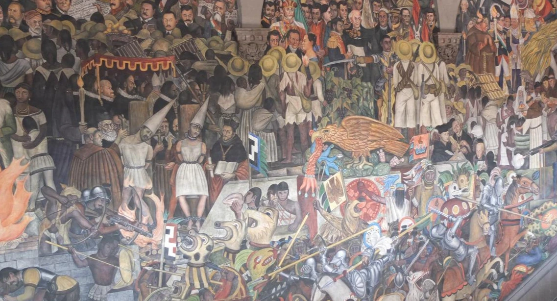 벽화는 얼핏 우스꽝스럽지만 매우 정교하고 사실적이다. 후아레즈의 손에 헌법을 그려, 그가 선거로 선출된 대통령임을 암시하는 식이다. 스페인 군인의 심장을 뽑아 들고 있는 아즈텍 사제의 자세는 어떤가. 유독 추하게 그려진 침략자 코르테즈의 얼굴에서는 멕시코인의 기분이 고스란히 전해졌다.