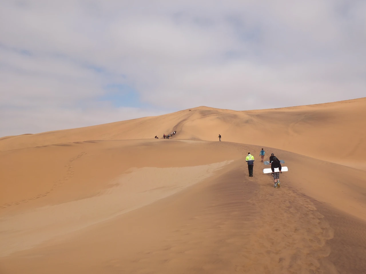 녀석은 다시 속도를 내며 사라져 버렸고, 결국 나는 홀로 투어차량에 던져졌다. 약 스무 명 정도 되는 참가자들은 헤수스의 예상대로 전부 유럽인들이었다. 복잡한 생각이 밀려들어올 때쯤, 간단한 설명이 끝났고 사람들은 저마다 보드를 하나씩 짊어지고 모래언덕을 오르기 시작했다. 모래 언덕 꼭대기까지는 겨우 500m 정도. 그런데도 앞으로 나아가질 않는다. 발등을 덮은 사막의 모래는 한걸음을 올라가면 꼭 그만큼 미끄러졌다. 뒤에서 그 행렬을 보고 있으니 끊임없이 돌을 굴리는 시지프스 같다.