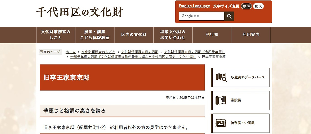 이왕가의 집이라는 이름으로 영친왕 저택이 도쿄 23구 중 하나인 치요다구의 문화재 사이트에 소개되어 있다. 이용자 외에는 견학할 수 없다는 문구가 눈에 띈다.