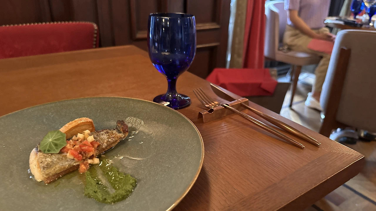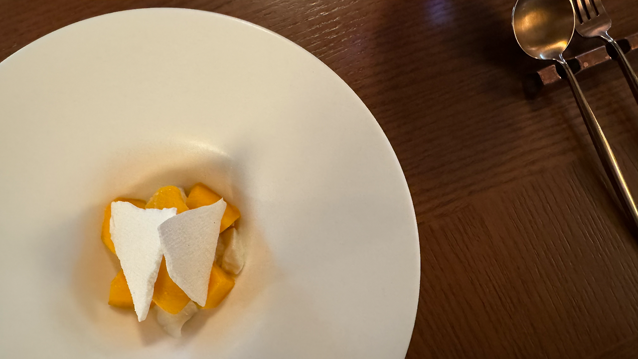 자리에 안내받고 메인으로 삼치 포와레・노헤지 순무・그르노블 소스를, 디저트로는 미야자키 망고와 코코넛 판나코타를 선택 후 기다렸다.