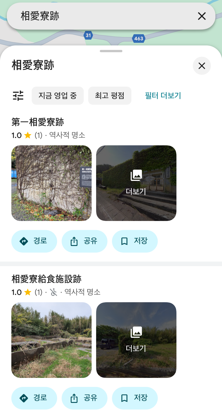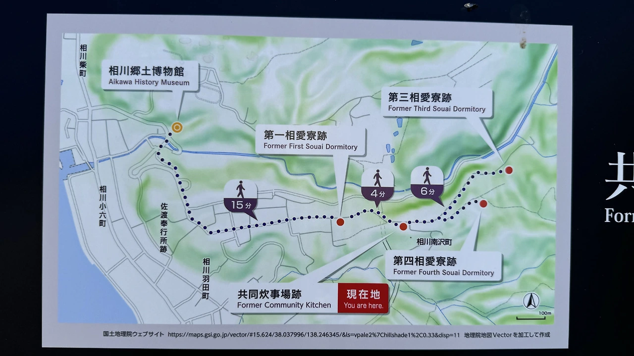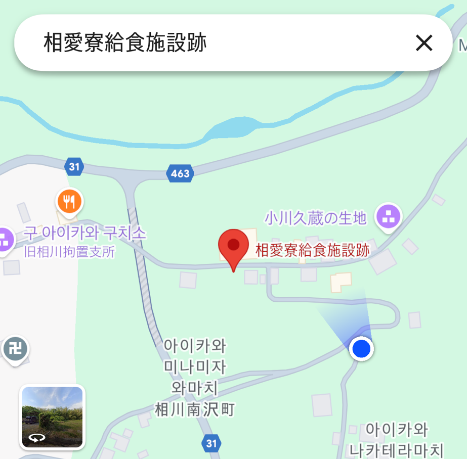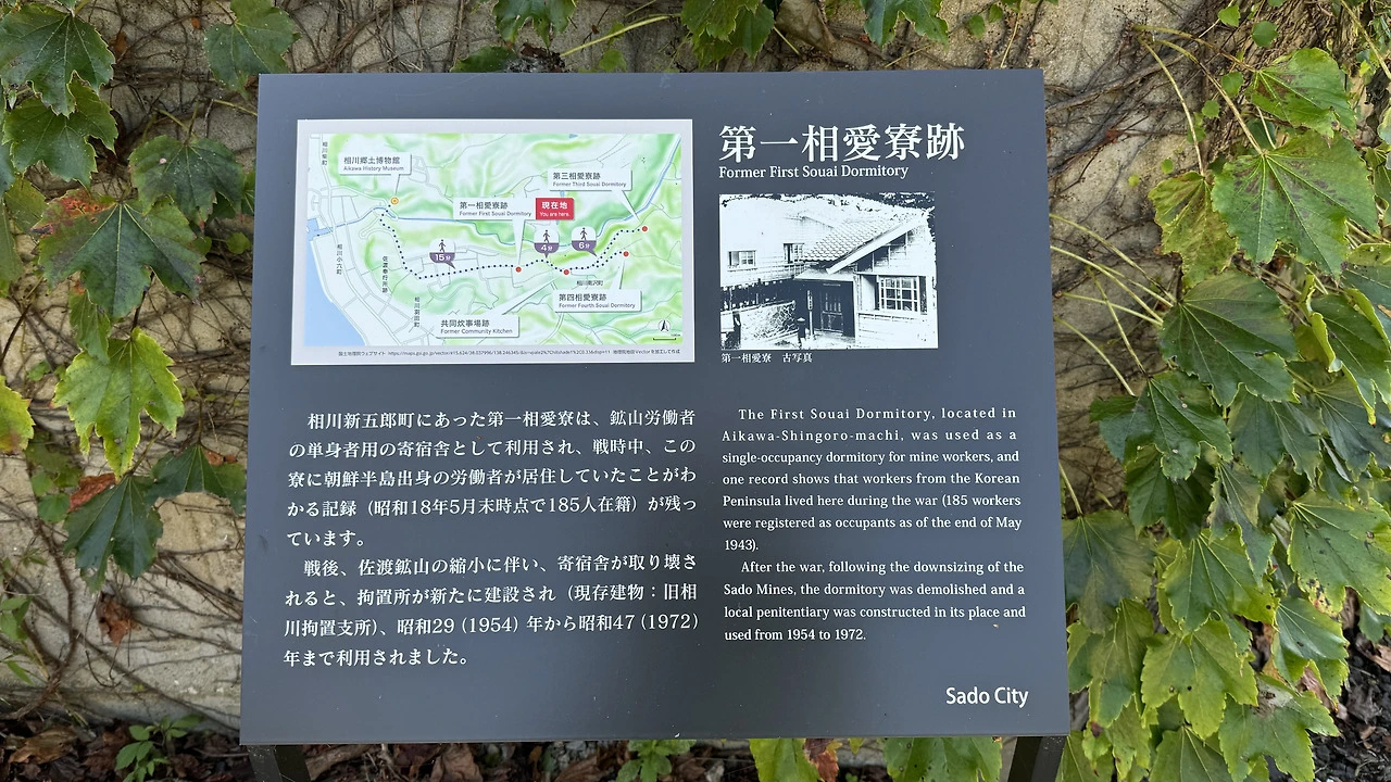 그러나 조선인 기숙사 터를 찾는 일은 쉽지 않았다. 구글맵에서 ‘사도광산 조선인 기숙사 터’, ‘상애료터’, ‘소아이료터(상애료의 일본어 발음)’ 등 다양한 키워드로 검색했지만 결과가 나오지 않았다. 혹시나 하는 마음에 일본어로 ‘相愛寮跡(상애료터)’를 입력하자, 그제서야 ‘제1상애료터(第一相愛寮跡)’와 ‘상애료급식시설터(相愛寮給食施設跡)’ 두 곳이 검색되었다. 우선 ‘상애료급식시설터’부터 방문하기로 했다.