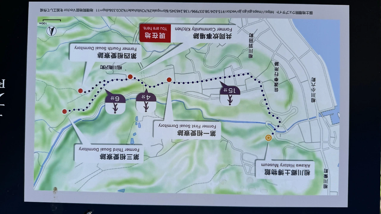 게다가 안내판의 지도는 심지어 방향이 거꾸로였다. 지도상으로는 현 위치에서 왼쪽으로 가면 제1상애료터가, 오른쪽으로 가면 제3상애료터와 제4상애료터가 나올 것처럼 표시되어 있었지만, 실제로는 그 반대였다. 일본은 ‘안내판을 설치했다’는 형식적 약속 이행에만 머무를 뿐, 그 내용의 진정성과 정확성에는 책임을 지지 않고 있다. 이에 대해 필자는 직접 사도시에 문의를 보냈고, 그 결과는 뒤에서 다시 살펴보겠다.