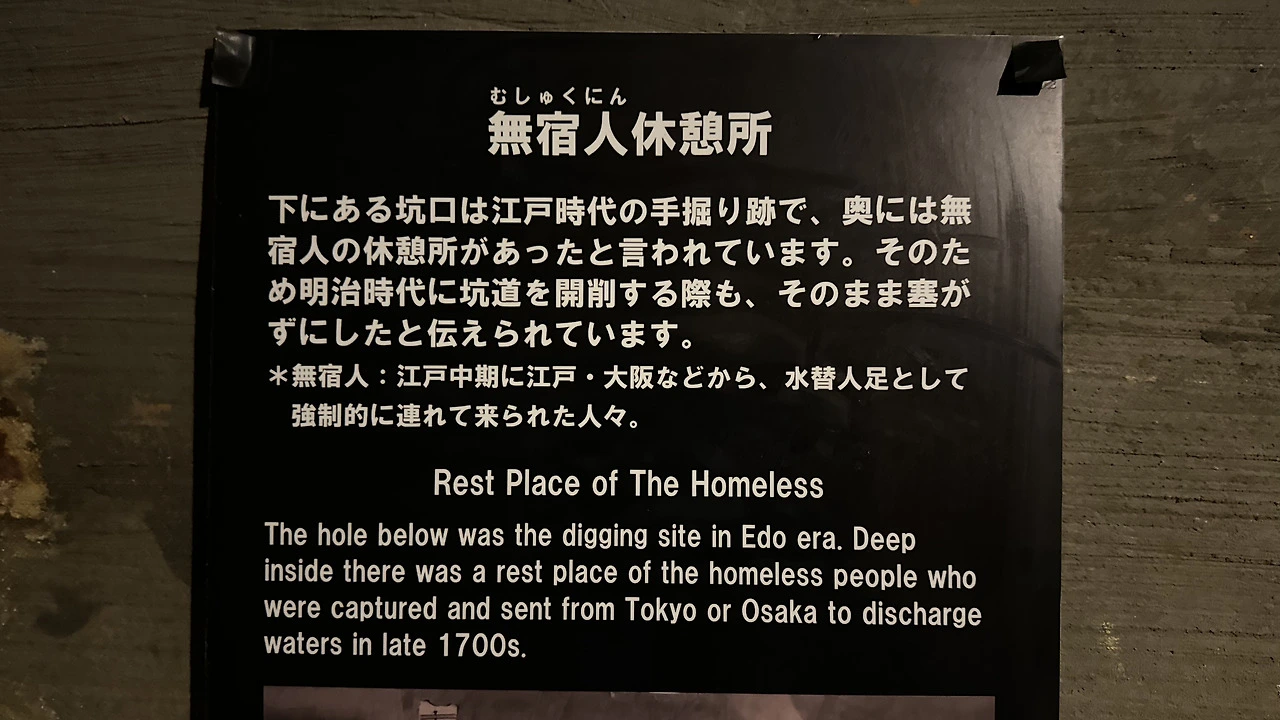 그런데 무숙인(無宿人)에 대한 언급을 찾아볼 수 있었다. 무숙인이란 에도 중기에 에도·오사카 등지에서 배수 인부(水替人足)로 강제적으로 끌려온 사람들을 가리키는데, 일본어에는 '強制的に(강제적으로)'라는 문구가 들어가 있고 영어 안내에도 'captured and sent(붙잡혀 보내졌다)'라는 함의된 강제성이 보인다. 그렇다면 무숙인에 대한 언급 말고, 한국인에 대한 언급은 아예 없는 걸까?