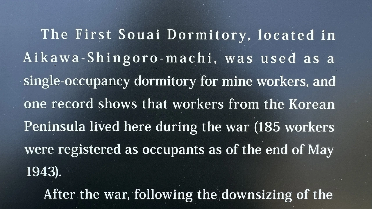 The First Souai Dormitory, located in Aikawa-Shingoro-machi, was used as a single-occupancy dormitory for mine workers, and one record shows that workers from the Korean Peninsula lived here during the war (185 workers were registered as occupants as of the end of May 1943). After the war, following the downsizing of the Sado Mines, the dormitory was demolished and a local penitentiary was constructed in its place and used from 1954 to 1972.