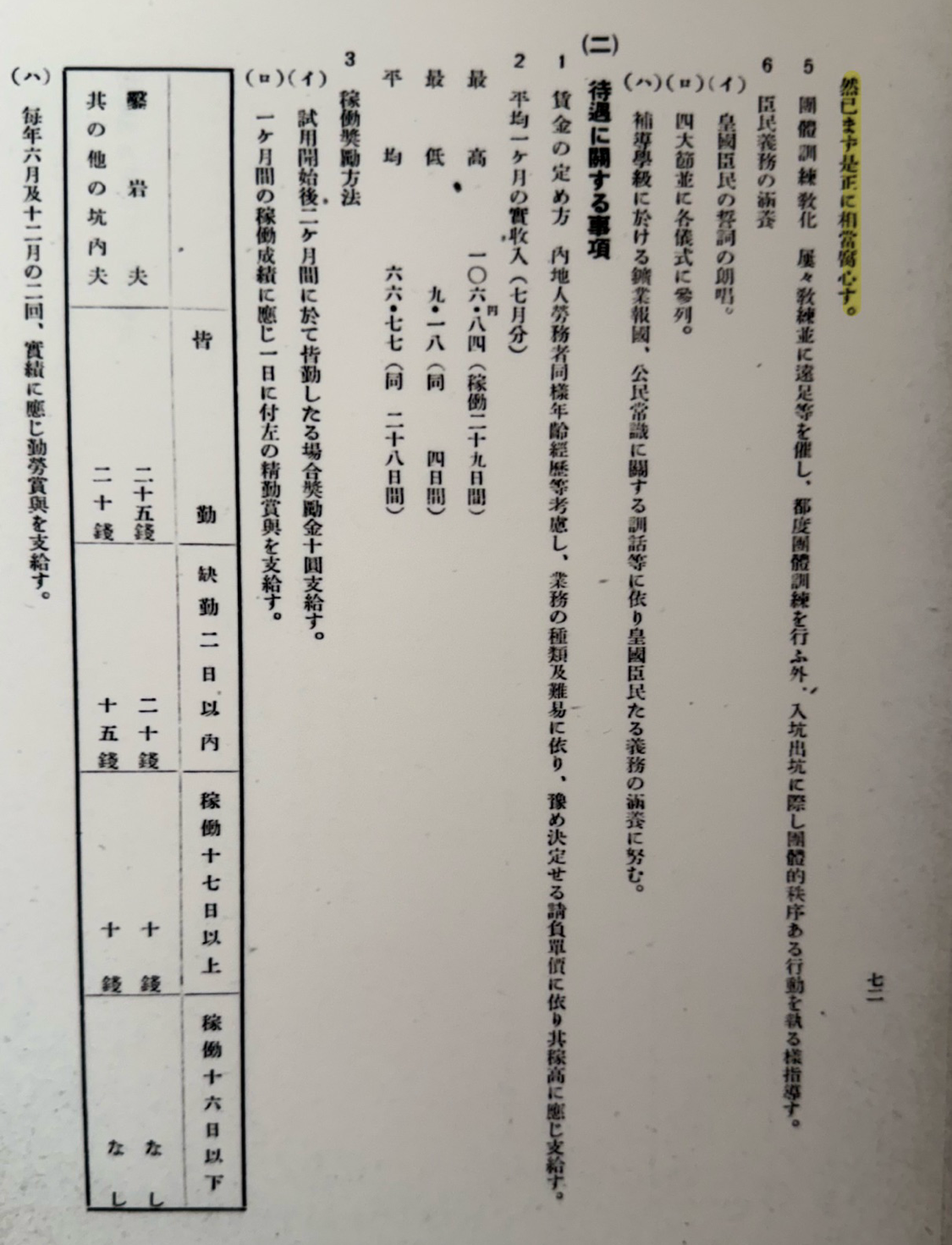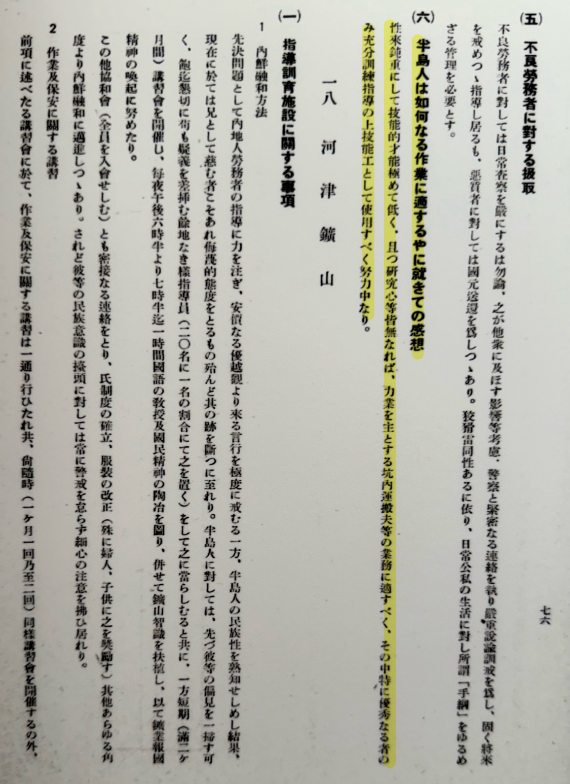 조선인들은 타고나길 우둔하고 게으르며(性來钝重), 기술적 재능이 매우 낮고, 또한 연구심이 전혀 없으므로, 주로 육체노동, 즉 갱내운반(坑內運搬)등에 적합하다.