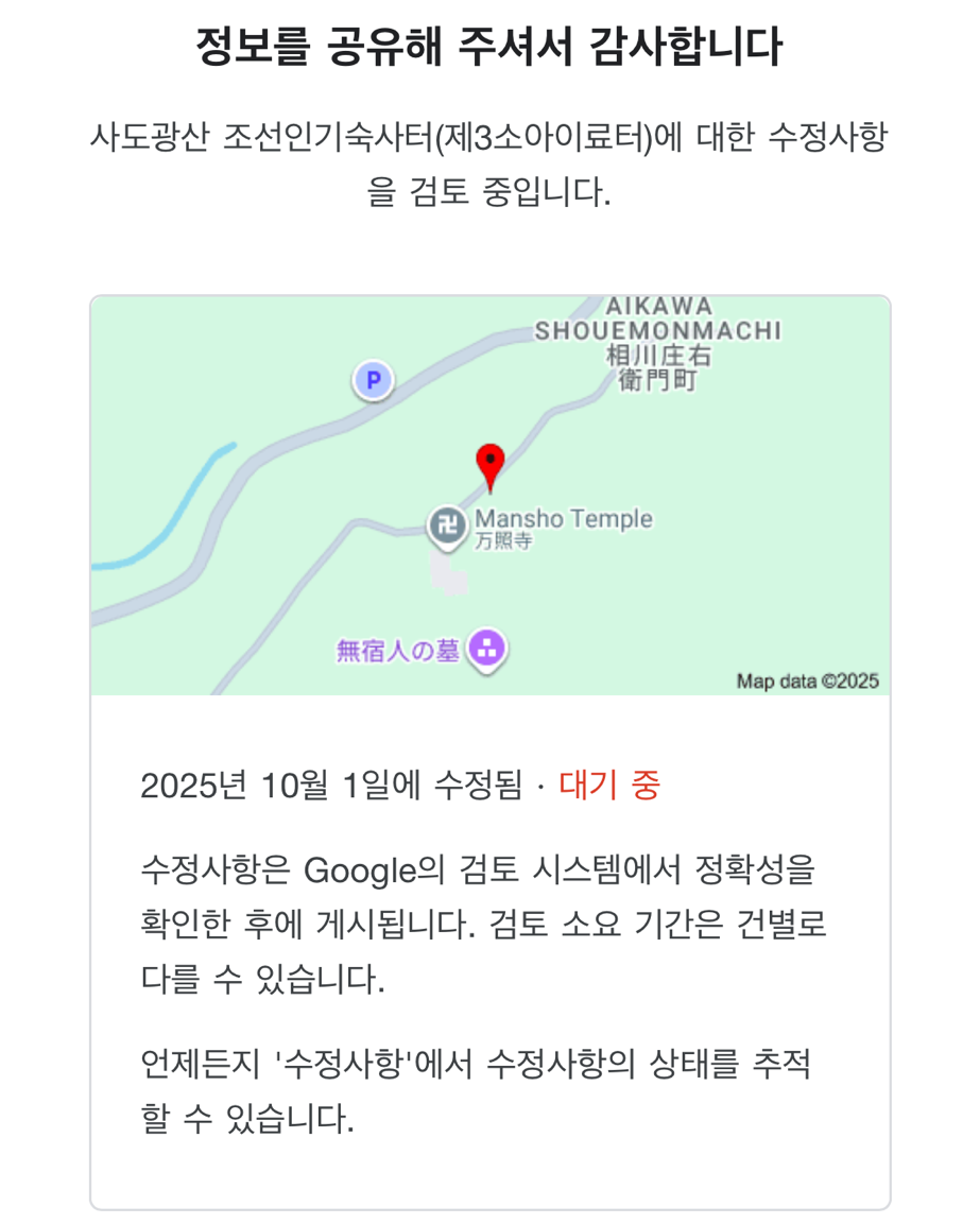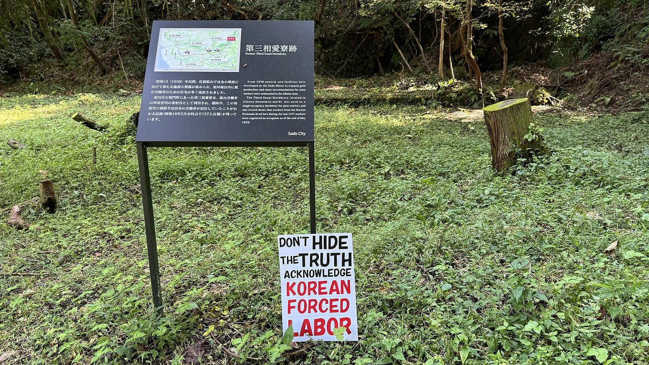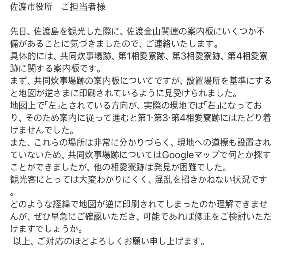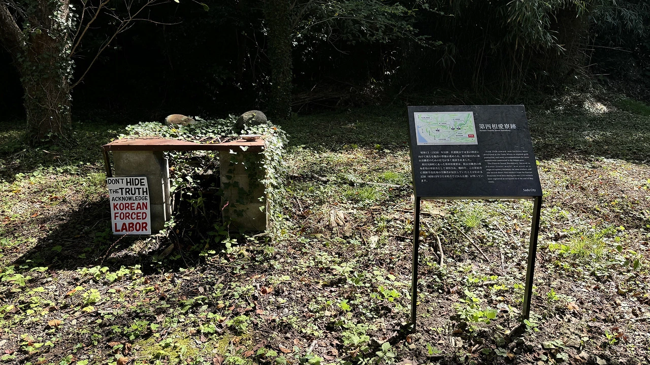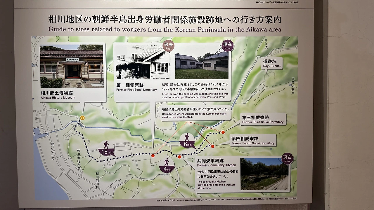 제3상애료터와 제4상애료터를 비교해 본 결과, 두 기숙사는 위치한 마을 이름과 조선인 노동자 수만 다를 뿐, 문구는 완전히 동일했다. 조선인 노동자들에 대해 더는 할 말이 없었던 걸까? 남아 있는 기록이 적지 않은데도, 왜 안내문에는 그들의 존재가 이렇게 공허하게 처리되어 있을까. 지도는 거꾸로 실려있고, 찾아가는 길에는 이정표 하나 없었다. 겨우 도착한 자리에는 복사해 붙인 듯한 설명판 한 장이 전부. 사도시에 직접 문의해 보았다.