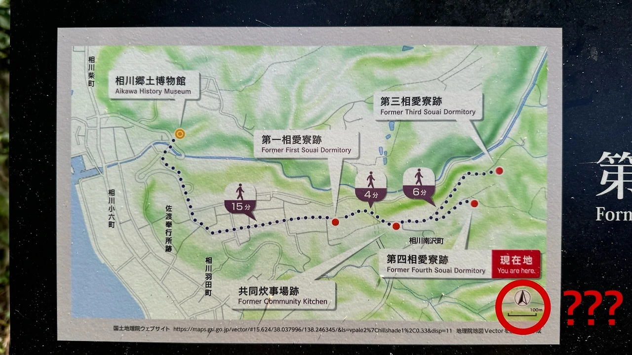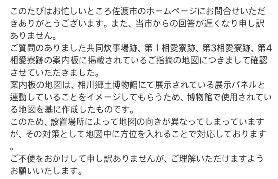 또한, 저희 시의 답변이 늦어진 점 진심으로 사과드립니다. 문의해 주신 공동취사장터, 제1상애료터, 제3상애료터, 제4상애료터의 안내판에 게재된 지도와 관련하여 확인하였습니다. 해당 안내판의 지도는 아이카와향토박물관에 전시되어 있는 패널과 연동된 형태로 보이도록 하기 위해, 박물관에서 사용 중인 지도를 바탕으로 제작된 것입니다. 이 때문에 설치 장소에 따라 지도의 방향이 달라지게 된 부분이 있으며, 그에 대한 대응으로 지도 내에 방위 표시(동서남북 표기)를 넣어 처리하였습니다.