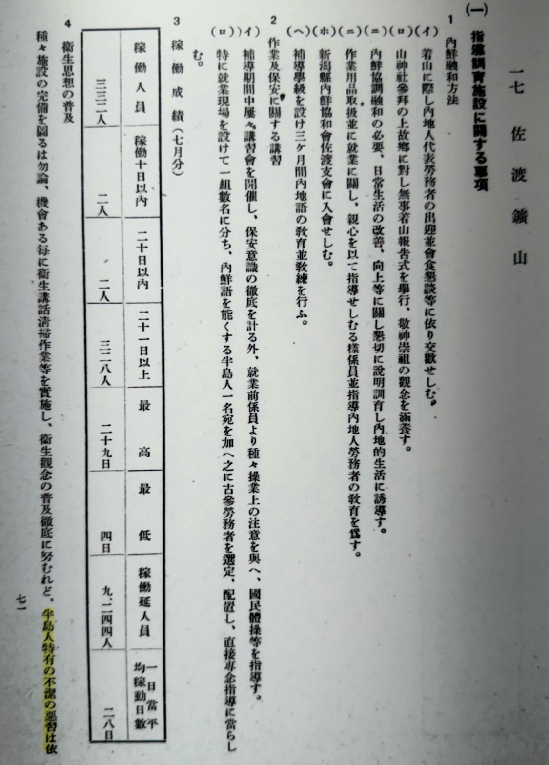 도표를 통해 직무별 조선인과 일본인의 수를 비교해 놓았지만, 그것만으로는 당시의 실태를 설명하기엔 부족했다. 한쪽 벽면을 가득 채운「사도광업소 조선인 관리에 대하여(1943년)」문서에는 조선인 노동자에 대한 노골적인 멸시와 차별이 여러 차례 언급되어 있었음에도, 이러한 내용은 영어로는 일절 제공되지 않는다. ‘도망 방지(逃亡防止)’라는 항목이 공식 문서에서 논의될 정도로 가혹했던 노동 환경을 고려한다면, 전시는 단순한 수치 비교에 그칠 것이 아니라 보다 구체적이고 진정성 있는 방식으로 재구성될 필요가 있다. 일본 정부와 사도시는 형식적인 ‘존재의 인정’에 머물지 않고, 실질적인 역사적 책임을 반영하는 후속 조치를 취해야 할 것이다.