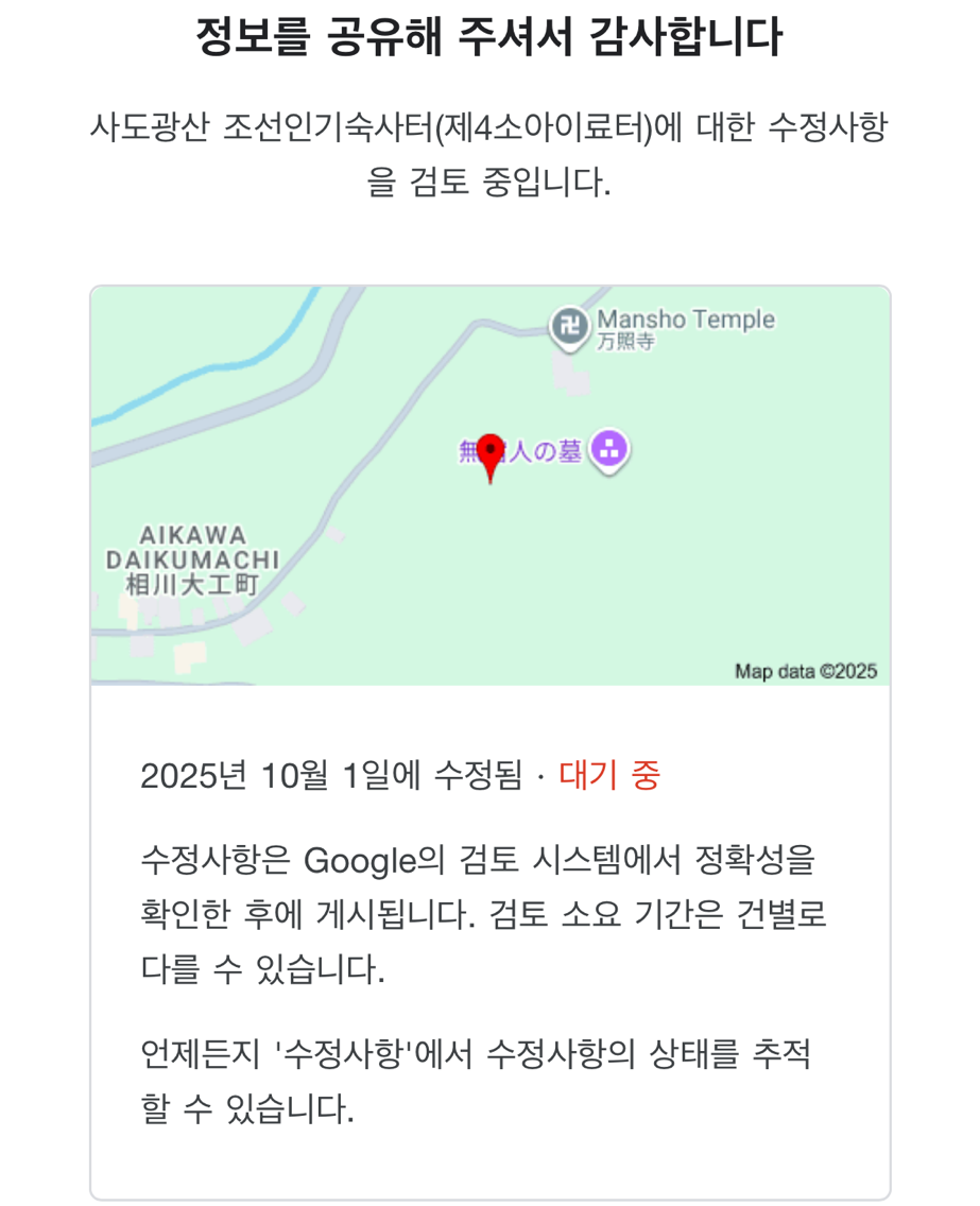 먼저 공동취사장터 안내판의 경우, 설치된 위치를 기준으로 보면 지도가 거꾸로 인쇄된 것처럼 보였습니다. 지도상에서 ‘왼쪽’으로 표시된 방향이 실제 현장에서는 ‘오른쪽’이 되어 있었고, 그 결과 안내에 따라 이동했을 때 제1·제3·제4상애료터에는 도착할 수 없었습니다. 또한 이들 장소는 매우 찾기 어렵고, 현장으로 가는 이정표도 설치되어 있지 않아, 공동취사장터의 경우에는 구글지도를 이용해 가까스로 찾을 수 있었지만, 다른 상애료터들은 발견하기가 매우 어려웠습니다. 이러한 상황은 관광객 입장에서 매우 혼란스럽고, 잘못된 안내로 인해 불편을 초래할 우려가 있습니다. 지도가 거꾸로 인쇄된 경위는 알 수 없지만, 부디 빠른 시일 내에 확인해 주시고, 가능하다면 수정도 검토해 주시면 감사하겠습니다. 이상입니다.