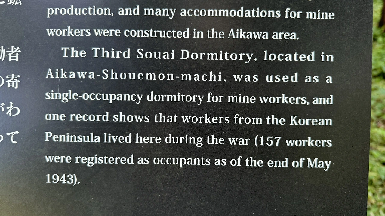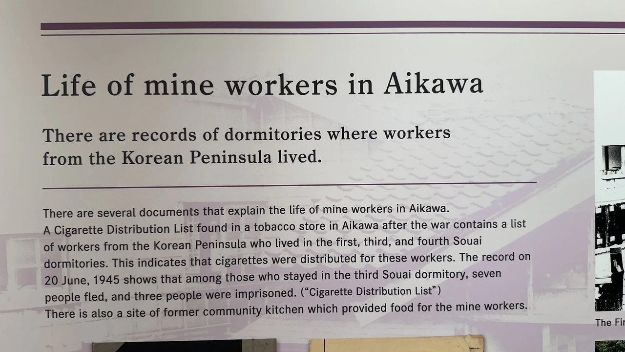 일본어와 영어가 병기된 패널 형태의 전시물은 단 세 개뿐이었다. 그중 하나는 ‘조선반도 출신자를 포함한 노동자들의 과중한 노동 환경’, 또 하나는 ‘조선반도 출신자를 포함한 노동자들의 출신지’, 마지막 하나는 ‘아이카와 광산 노동자들의 생활’이라는 제목이었다. 앞서 언급했듯, 과연 이 전시 공간이 조선인 노동자를 위한 전시인지 의문이 들 수밖에 없는 구성이다. 조선인 노동자는 단순히 ‘노동자’라는 큰 범주의 일부로 축소되어 있었고, 전시는 마치 모든 노동자가 비슷한 수준의 고된 환경에 처해 있었다는 인상을 은연중에 전달하려 하고 있었다. 게다가 전시물의 내용 또한 부실했다. 세 개의 전시물 중 그나마 실질적으로 과도한 노동 환경을 다루고 있는 ‘조선반도 출신자를 포함한 노동자들의 과중한 노동 환경’ 전시물의 내용은 다음과 같다.
