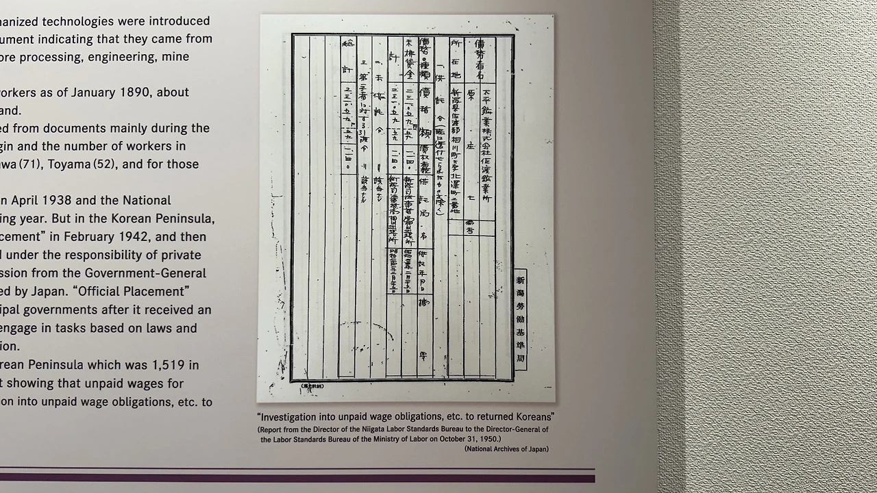 조선인 노동자들이 처했던 가혹한 노동환경을 기리는 새로운 전시물 설치. 이것이 일본이 한국에 약속한 내용 중 하나였다. 물론 조선인 노동자들이 더 위험한 작업을 맡았다는 기록은 명시되어 있었지만, 전시의 전체적인 초점은 ‘조선인 노동자가 있었다’는 사실 자체에 맞춰져 있었다. 예를 들어, ‘담배 배급대장’에 조선인 노동자의 이름이 기록되어 있으니 조선인 노동자가 있었다, 특별고등경찰 월간 보고서에 조선인 관련 사건이 기록되어 있으니 조선인 노동자가 있었다, 조선인들의 취급 방법, 일본어 교육, 위생 교육 등과 관련된 사료가 있으니 조선인 노동자가 있었다―전시 내용은 대체로 이런 식으로 구성되어 있었다. 앞서 사도광산 내 기기공장, 상애료터 등에서도 살펴보았듯이 일본은 조선인 노동자가 ‘존재했다’는 사실을 부정하지 않는 입장을 취하고 있다. 하지만 그 이상, 즉 조선인 노동자들이 겪은 구체적 고통과 불평등, 혹은 노동 환경의 현실을 드러내는 것은 넘지 말라는 보이지 않는 선이 분명히 존재했다.