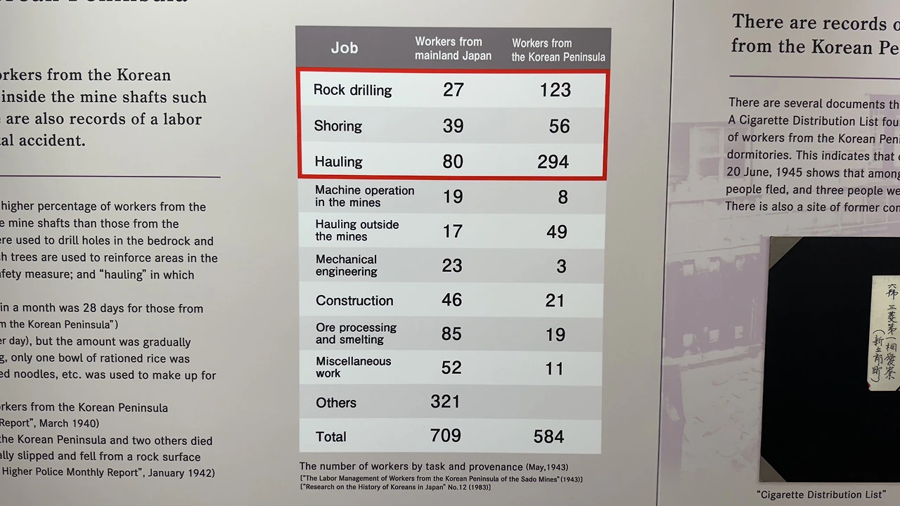 ・사도광산에서 일한 조선반도 출신 노동자들은 암석 파쇄, 지주 설치, 자재 운반 등 위험한 갱내 작업에 종사한 비율이 높았다는 기록이 남아 있다.