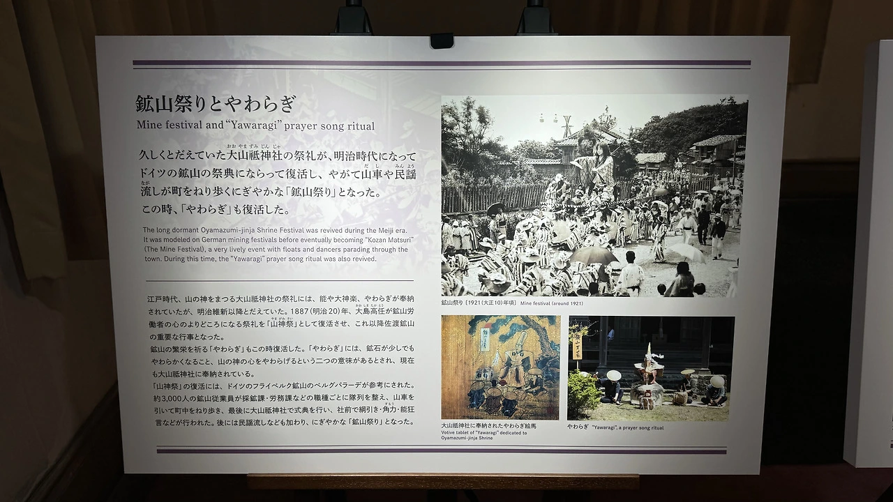 오오야마즈미 신사의 제례는 한동안 중단되어 있었으나, 메이지 시대에 들어 독일의 광산 축제를 본떠 다시 부활하였다. 이후 산차(山車, 장식 수레)와 민요 행진이 마을을 누비는 활기찬 ‘광산축제(鉱山まつり)’로 발전하였다. 이때, ‘야와라기(やわらぎ)’ 또한 함께 부활하였다.