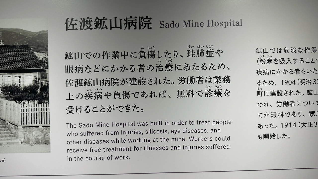 광산에서 작업 중 부상을 입거나, 규폐증이나 안질 등에 걸린 사람을 치료하기 위해 사도광산병원이 세워졌다. 노동자는 업무상 질병이나 부상일 경우, 무료로 진료를 받을 수 있었다.