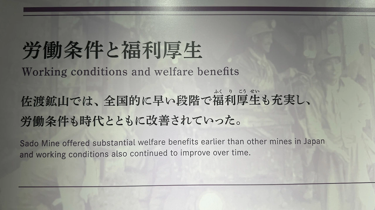 조선인 노동자에 대한 전시는 사도광산의 기기공장에서처럼 관람객의 시야에서 가장 먼 곳에 있었다. D전시실은 아이카와 향토 박물관의 메인 전시와는 동 떨어져, 계단을 올라 복도를 지나야 닿을 수 있는 건물의 가장 깊은 구석에 자리하고 있었다. 또한 그렇게 도착한 D전시실 정면에는, '조선반도 출신자를 포함한 광산 노동자들의 삶'이 아닌 '사도광산의 노동과 복리후생' 전시가 있었다. 앞서 1편에서도 언급했듯, 마트 진열조차 무작위로 이뤄지지 않는다. 전시는 공간의 언어로 메시지를 전한다. 이러한 전시 배치는 결코 우연이 아니다. 나 역시 그들이 의도한 동선대로, '사도광산의 노동과 복리후생' 전시부터 먼저 관람해 보았다.