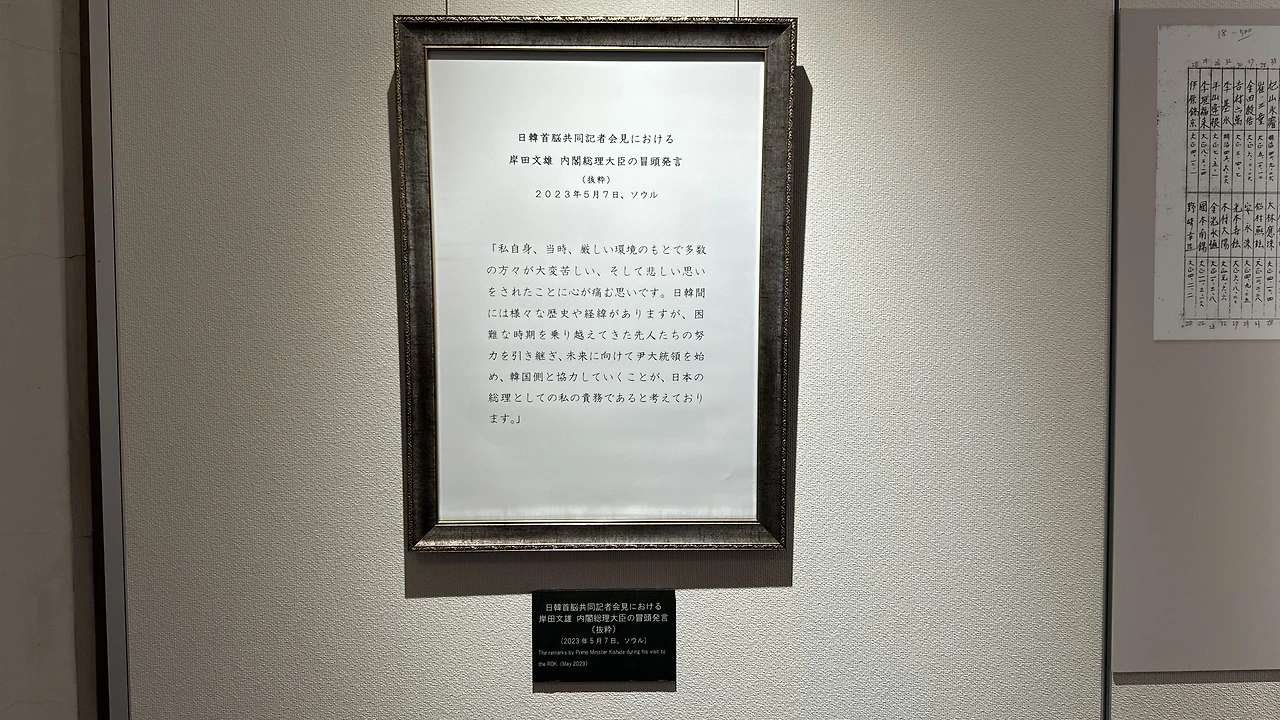 “저 역시, 당시 열악한 환경 속에서 많은 분들이 매우 고통스럽고, 또한 슬픈 경험을 하셨다는 점에 마음이 아픕니다. 한일 간에는 여러 역사와 경위가 있습니다만, 어려운 시기를 극복해 온 선인들의 노력을 이어받아 미래를 향해 윤 대통령을 비롯한 한국 측과 협력해 나가는 것이 일본 총리로서의 제 책무라고 생각합니다.”