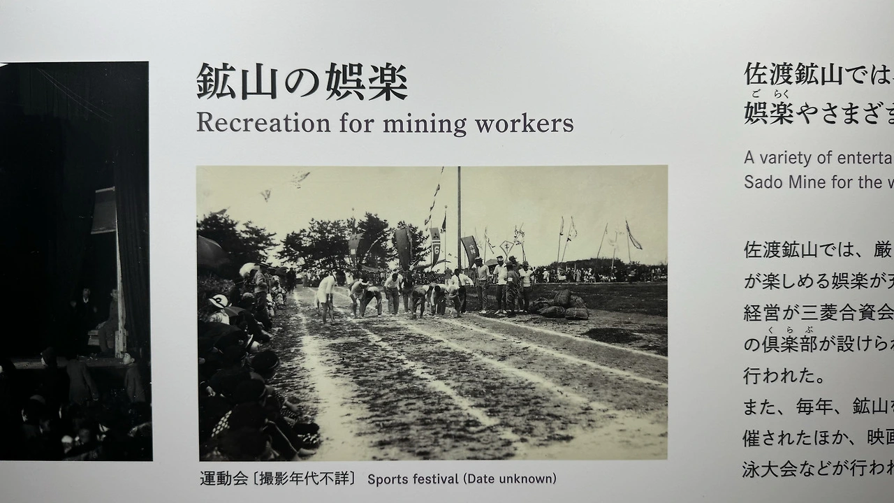 사도광산에서는 노동자와 그 가족이 즐길 수 있는 오락과 다양한 행사(催し)가 열렸다. 엄격한 노동의 틈틈이, 노동자와 가족이 즐길 수 있는 여가활동이 풍부하게 마련되어 있었다. 경영이 미쓰비시합자회사로 이관된 뒤에는 노동자들을 위한 클럽이 세워져, 여러 가지 행사나 취미 활동이 진행되었다. 또한 매년 광산 전체가 함께하는 ‘광산축제(鉱山祭り)’가 성대하게 열렸으며, 그 밖에도 영화, 연극, 연예대회, 운동회, 수영대회 등이 개최되었다.