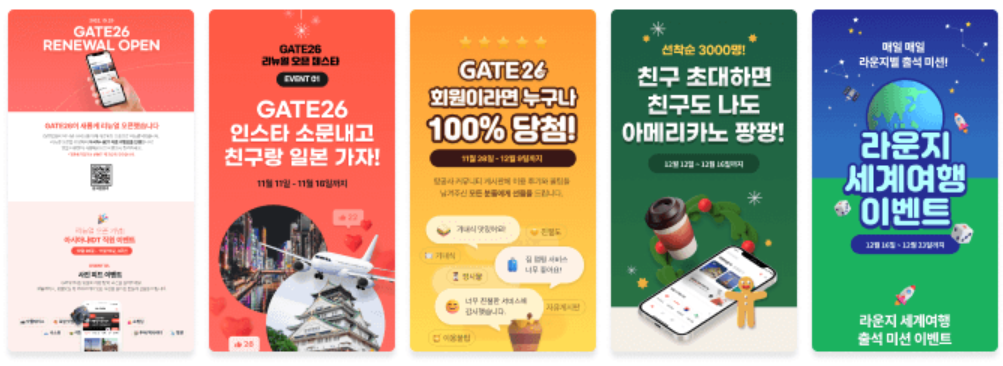 2022년 10월 26일 '리뉴얼 오픈 기념 직원 이벤트'를 시작으로 최근에 끝난 '라운지 세계여행 출석 미션 이벤트'에 이르기까지 GATE26을 좀 더 많은 사람들에게 알리고 적정 회원수 확보를 위한 여러 활동들을 진행해 왔습니다.