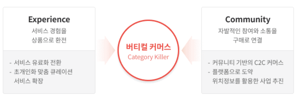 버티컬 커머스는 좁지만 깊게, 하나의 카테고리 또는 특정 분야에 집중해 전문성과 신뢰성을 기반으로 한 커머스 영역입니다. 이는 메인 서비스의 전방과 후방 비즈니스를 연결해 무분별하게 확장해 나가는 형태가 아닌, 특정 카테고리를 메인으로 하여 그 안에서 영향력을 넓혀나가는 카테고리 킬러(Category Killer)를 의미합니다. (예: 오늘의집, 마켓컬리, 무신사, 지그재그, 오늘회, 머스트잇 등)