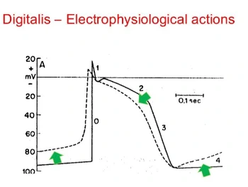 - Na/K pump 억제하여 세포 내 Ca 농도를 높임