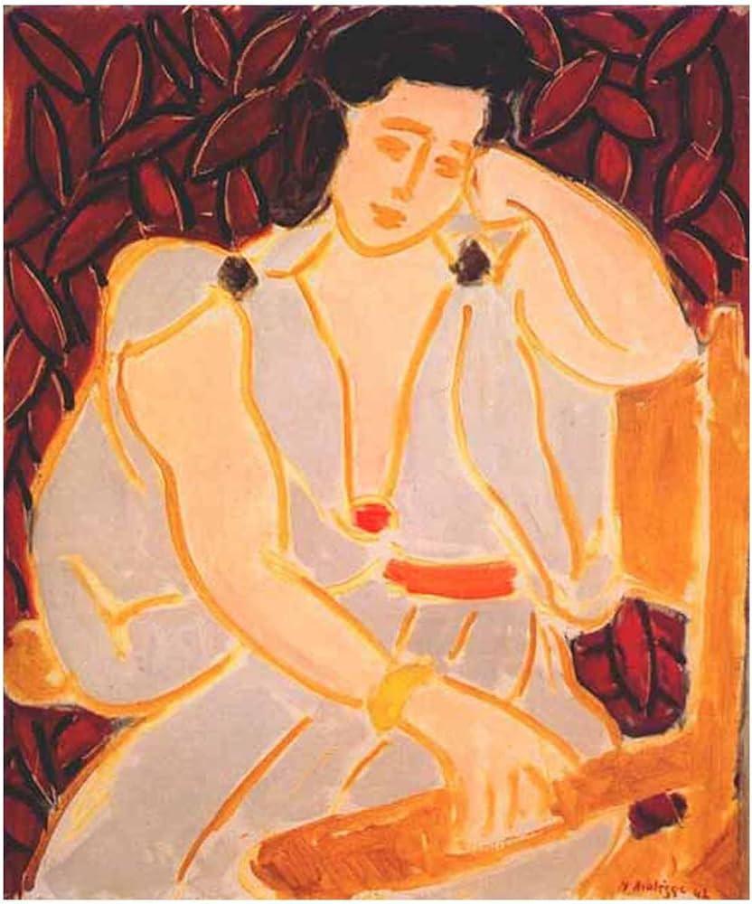 마티스는 71세에 큰 암수술을 받게 되었고, 수술 후유증으로 인해 붓을 잡는 것조차 힘들어졌습니다. 긴 회복기간을 갖게 되는데요. 이때 간호학과 학생이었던 모니크 부르주아(Monique Bourgeois)를 야간 간호사로 채용합니다. 모니크는 그를 돌보면서 책을 읽어 주고 그와 많은 토론을 나누기도 하였습니다. 그렇게 둘은 각별한 우정을 쌓게 되는데요. 모니크는 마티스 초상화의 모델이 되기도 했습니다.