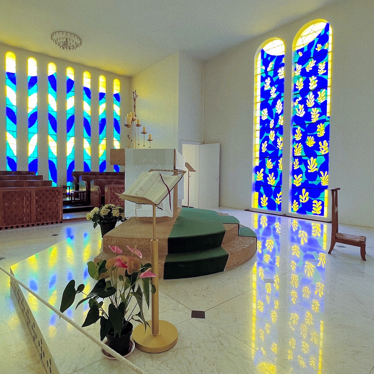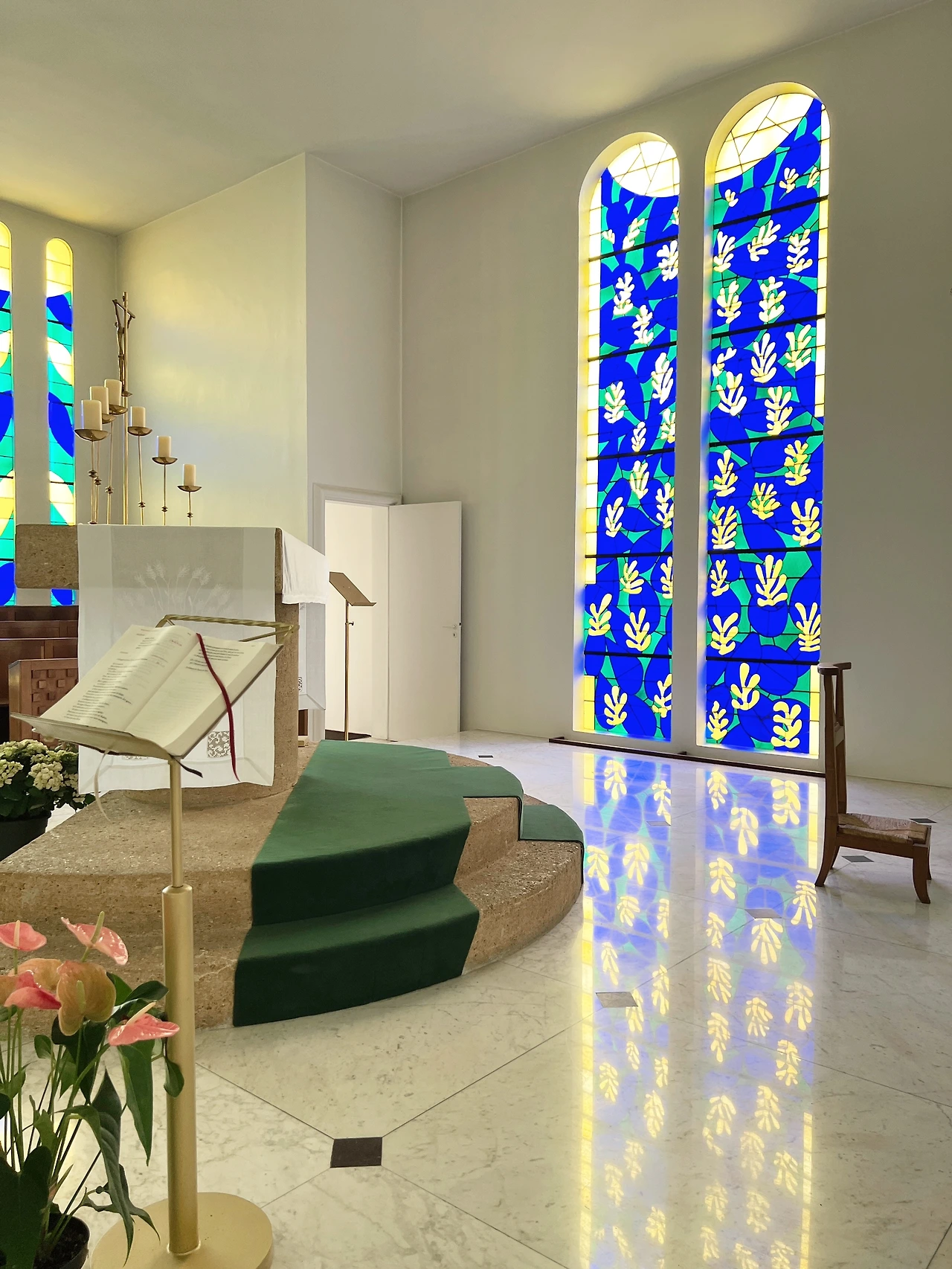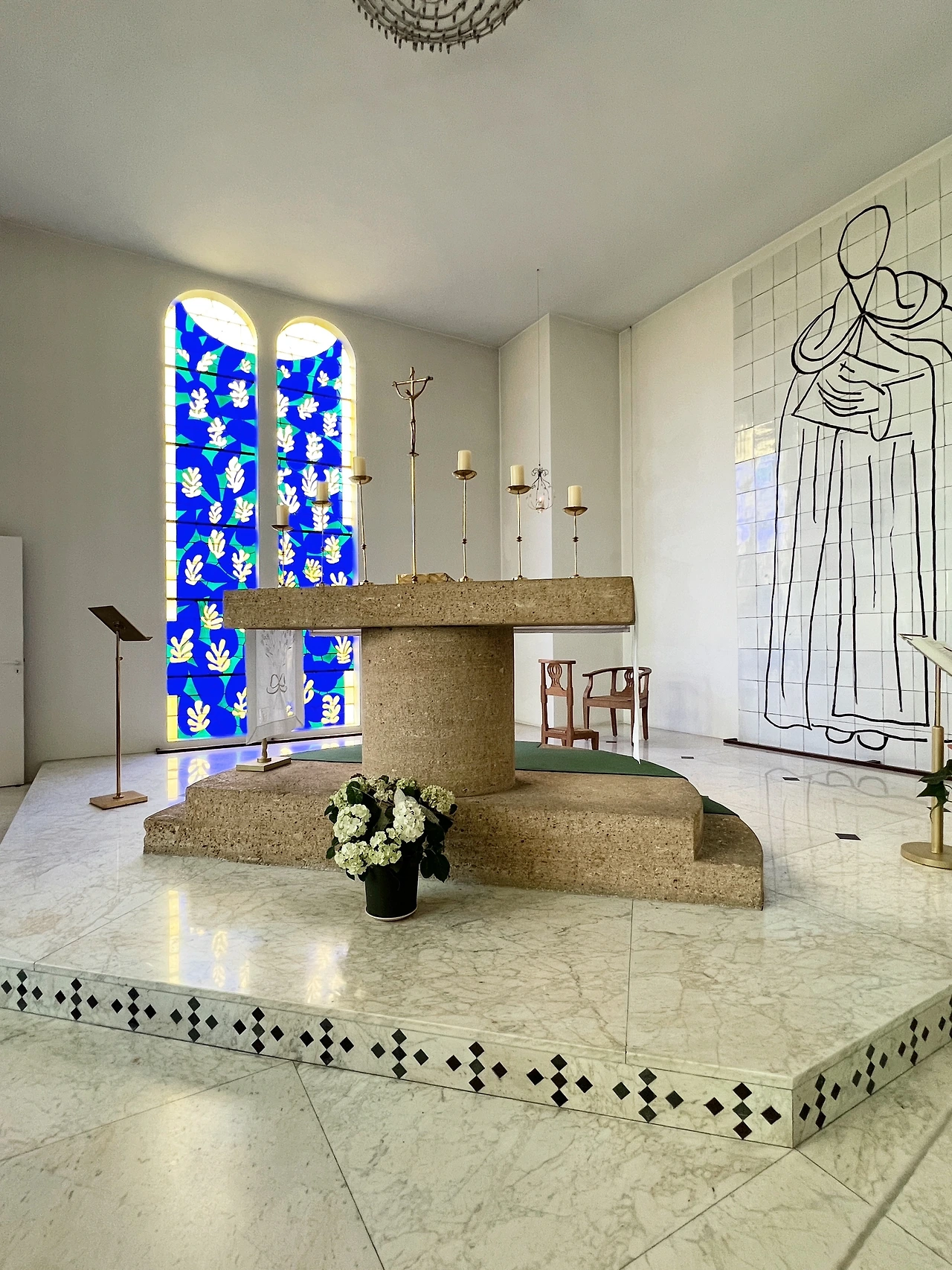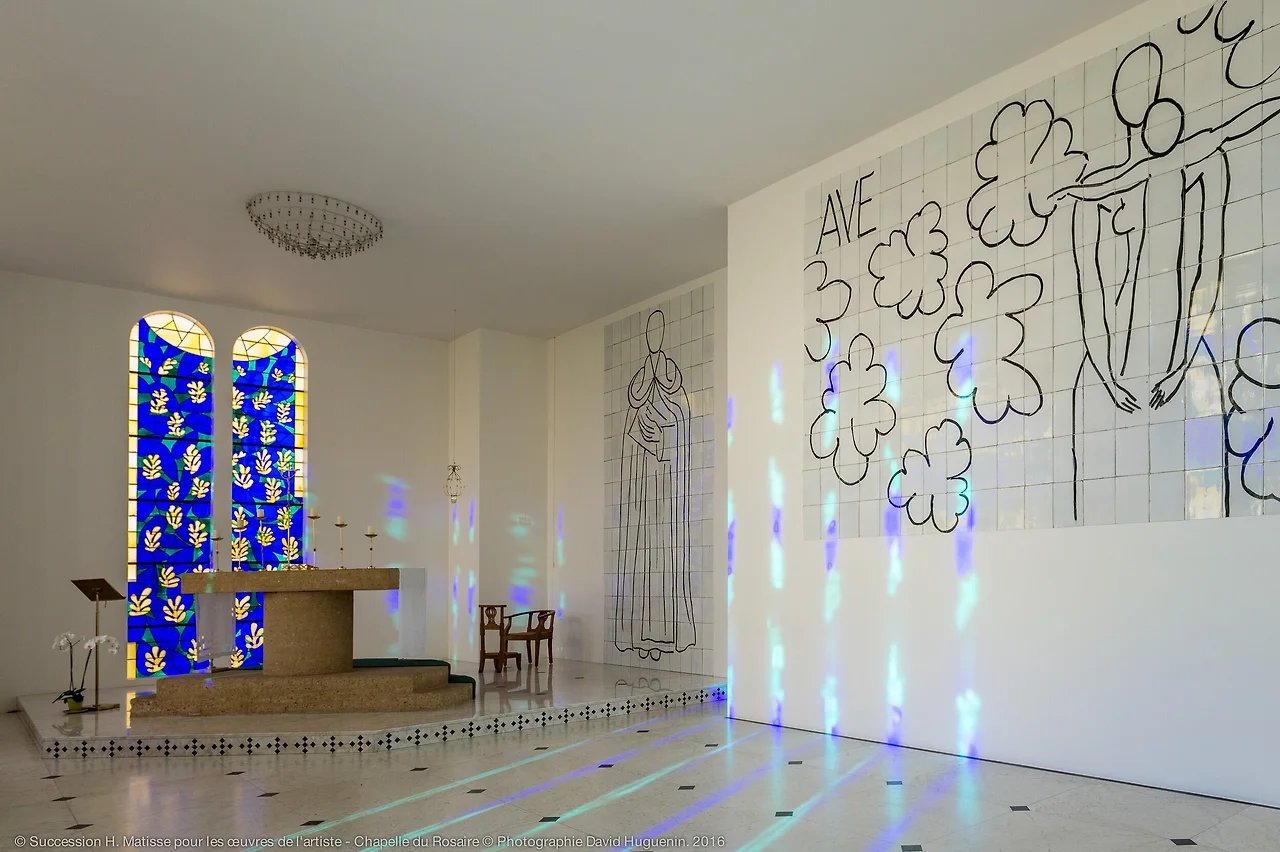 1943년, 마티스는 니스 옆에 있는 방스(Vence)라는 도시로 이사를 합니다. 그리고, 모니크는 수녀원에 들어가 자크 마리라는 이름을 얻고 수녀가 되어 2년 만에 다시 돌아옵니다. 자크 마리 수녀와 도미니크회 수녀들은 방스에 작은 성당을 지을 계획을 갖습니다. 마티스가 그들을 위해 성당을 디자인해 주기로 하죠. 건축은 오귀스트 페레 Auguste Perret와 루이 밀롱 Louis Milon de Peillon이라는 두 프랑스 건축가들이 맡았습니다. 마티스는 스테인글라스와 타일 벽의 대형 그림, 예배단상, 장식과 예배복 등을 디자인했습니다. 그는 4년 간 깊게 몰입하여 성당을 완성합니다. 스스로 화가 인생 전체를 통틀어 운명처럼 만난 작품이자 최고의 결실이라 말하기도 했습니다.