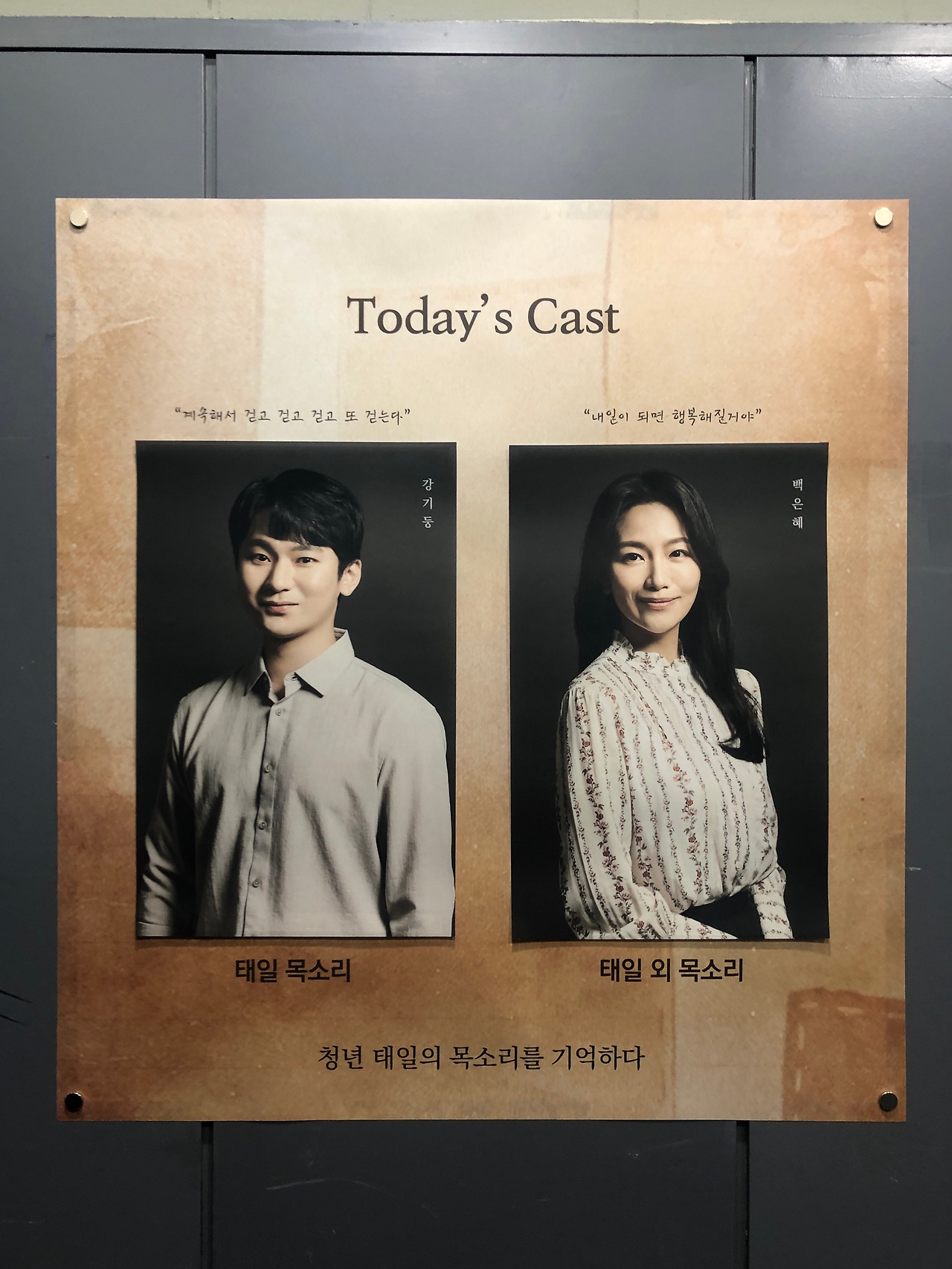 음악극 <태일>은 전태일 열사의 삶을 다룬 극으로, 뮤지컬과 연극 중간쯤 되는 듯한 형식을 띄고 있다. 태일의 목소리를 연기하는 남배우 1명과 태일의 주변 인물을 연기하는 여배우 1명이 합을 이룬다. 내가 본 날의 캐스팅은 매체와 무대 연기를 오가며 낯익은 얼굴이었던 ‘강기둥’배우와 작년 연극 <오만과 편견>으로 내게 강렬한 첫 인상을 남겨주었던 ‘백은혜’배우였다. 강기둥 배우는 순박한 눈매와 둥글둥글한 인상이 태일과 꽤 닮았다. 백은혜 배우는 태일의 어린 여동생부터 어머니와 아버지, 재단사 친구까지 남녀노소 경계 없이 넓은 스펙트럼의 연기를 보여주었다.