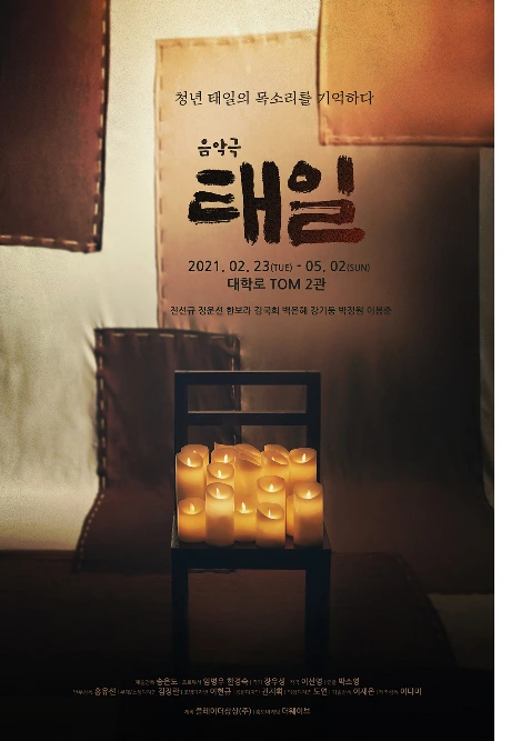 음악극 <태일>은 그의 죽음보다 삶을 따뜻하게 그려낸다. 투쟁에만 초점을 맞추지 않고, 어린 시절부터 마지막 결심까지 고르게 다루려고 노력한 것 같다. 특히 어린 소년의 풋풋함이 묻어난 장면과 넘버가 기억에 많이 남는다. 학교 가는 게 세상에서 제일 행복한 소년의 눈망울은 암흑 속 별처럼 초롱초롱하다. 극이 진행될 수록 초들이 점점 불을 밝혀 무대를 가득 채우는데, 태일이 얼마나 따뜻하고 인간애가 있는 사람이었는지 느껴진다.