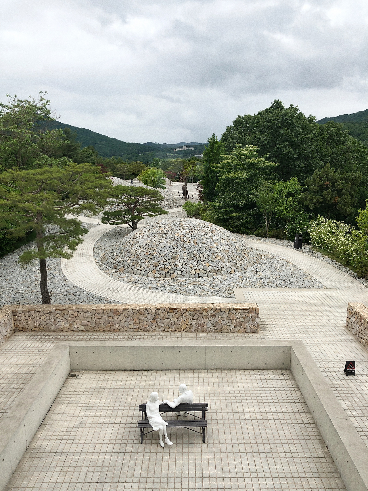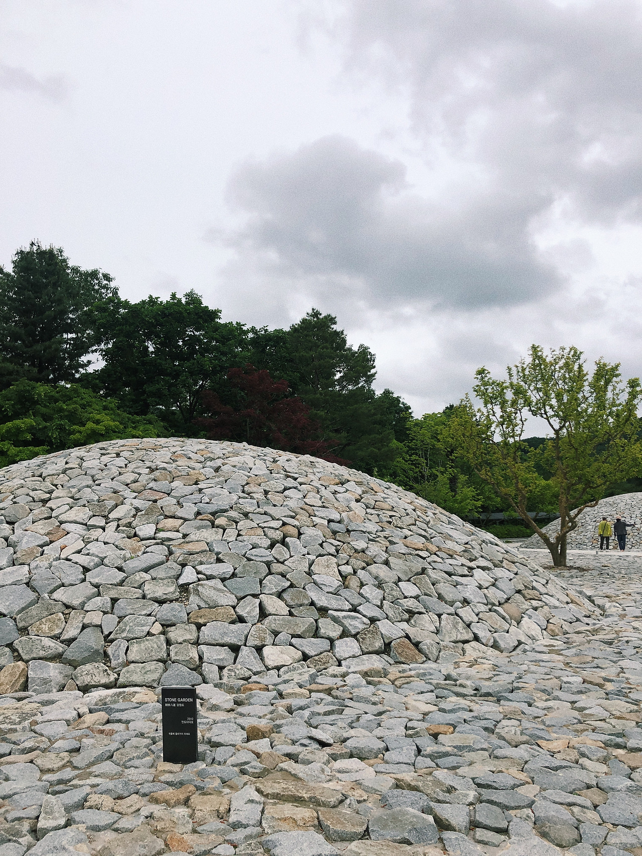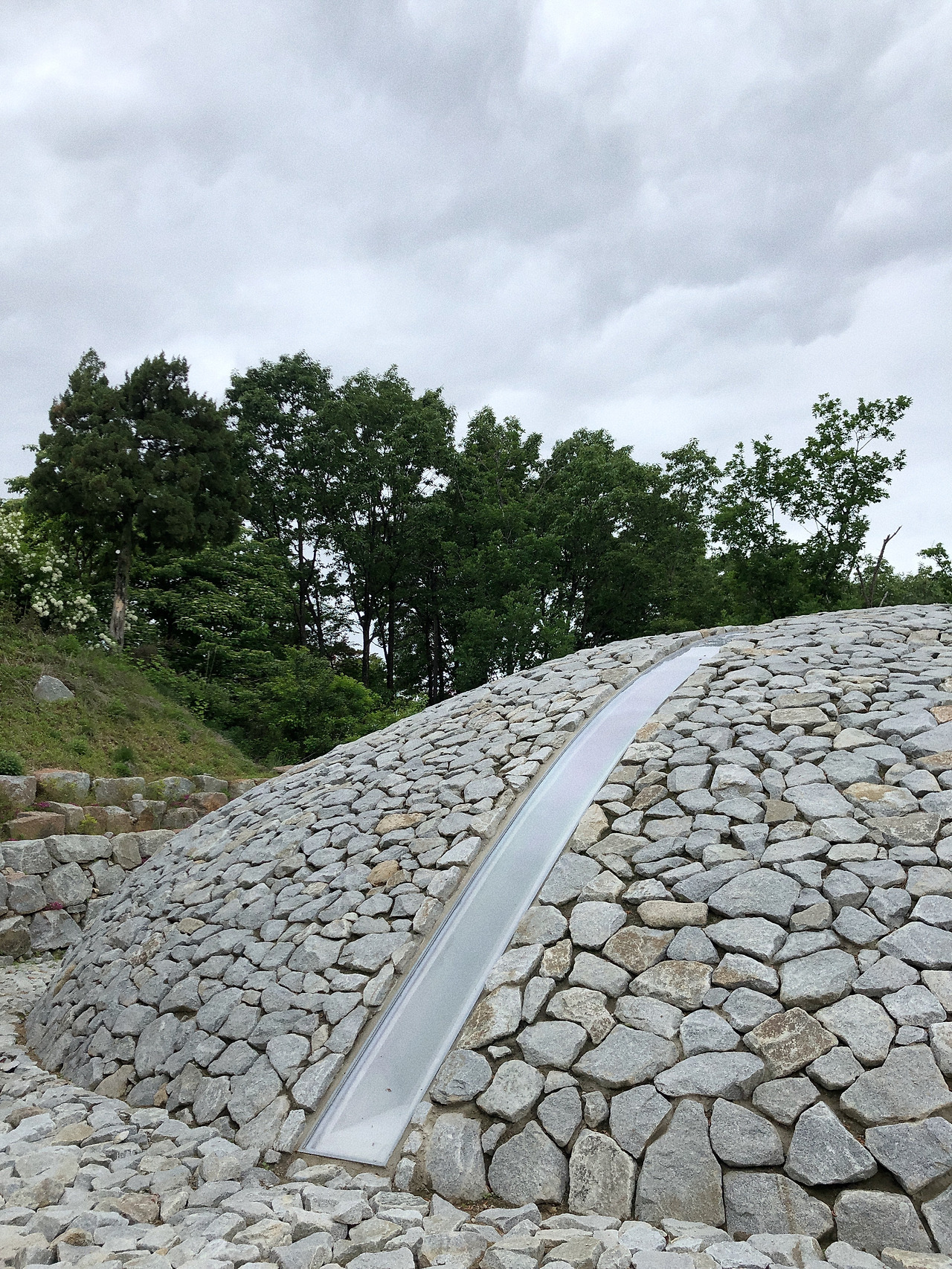 본관의 전시를 보고 나오면 스톤가든이 이어진다. 보이는 그대로 고분처럼 생긴 돔들이 이 공원의 지형을 만들어 내고 있다. 이 역시 안도 다다오의 작품이다. 각 작품에도 이름이 있는데, 한국의 팔도 지명이 적혀있다. 강원도, 전라남도, 평안북도... 한국의 지나간 역사와 숨결들이 무덤 속에 잠자고 있는 것만 같다.