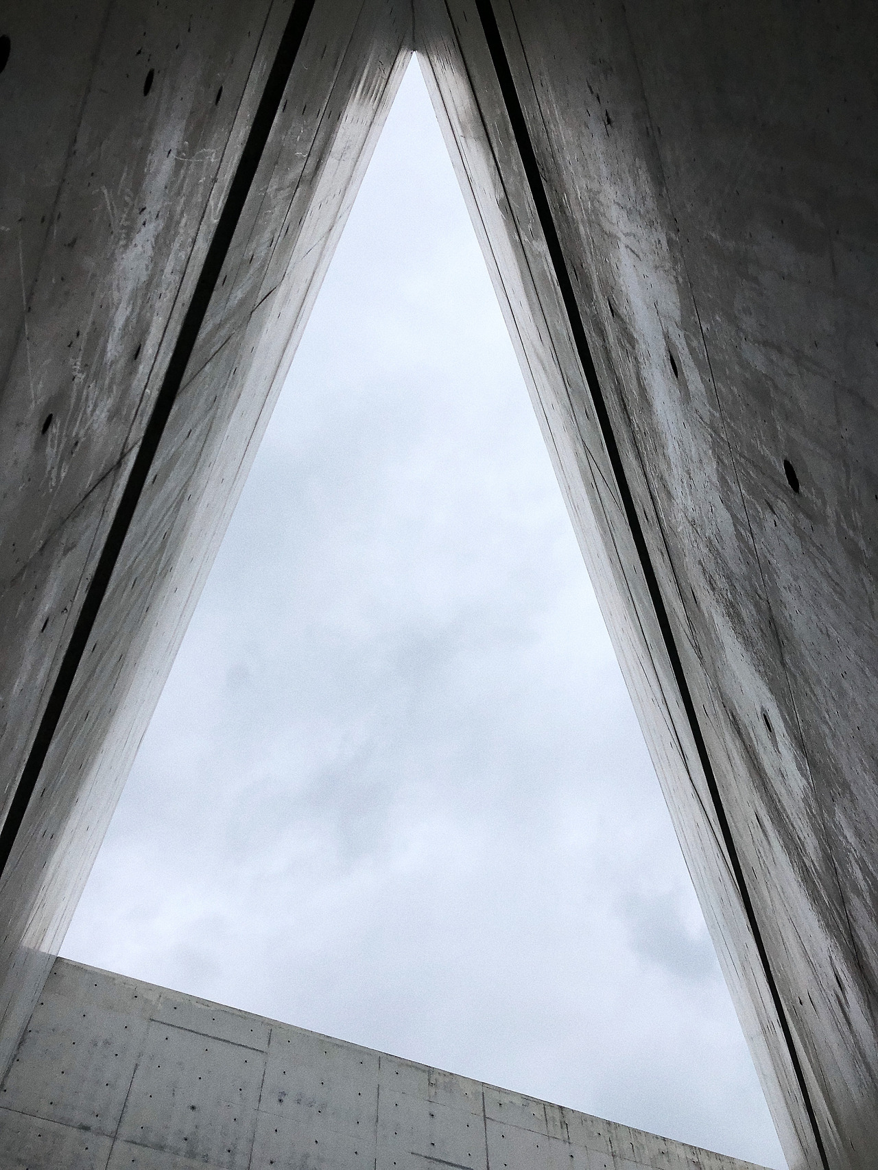 삼각코트. 건물 중간에 하늘을 향해 뻥 뚫린 공간이 있다. 이 공간에는 돌뿐이다. 가운데에 앉아서 벽면의 사선을 따라 올라가다가 삼각형 프레임 안의 하늘을 바라본다. 만약 하늘에서 이곳을 내려다본다면, 나는 지금 삼각형 안의 중심점일 것이다. 제임스 터렐관에서도 이런 비슷한 공간이 또 있는데, 뮤지엄 산에서는 하늘을 볼 일이 많아진다. 이 거대한 자연 속에서 아주 작은 자연의 움직임에도 미묘하게 반응하는 나라는 존재를 인식하게 된다.