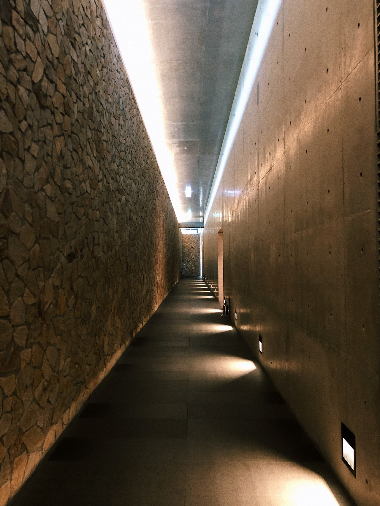 건물 안에서도 산책은 이어진다. 전체적으로 낮은 조도와 회색 벽이 외부 세계와 단절된 동굴 같기도 하다. 각 전시실 사이에 이어지는 긴 통로는 마치 '페르마타 [fermata]'를 의미하는 듯하다. 이전 전시의 여운을 오랫동안 느끼고, 새로운 공간으로 들어가기 전 충분한 쉼을 갖게 해 준다.