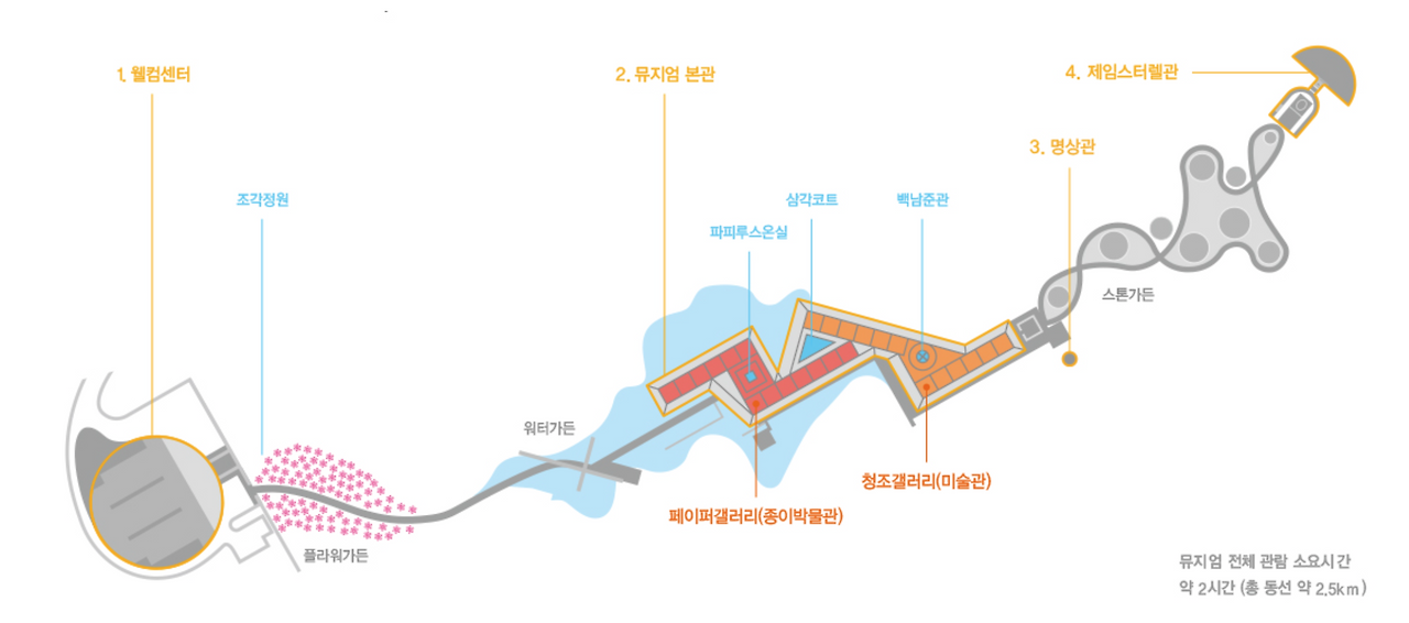 직원이 친절하게 시간대별로 루트를 짜준다. 명상관과 제임스 터렐관은 입장 시간이 정해져 있기 때문에, 몇 시부터 몇 시까지 어느 곳을 구경하고 다음 장소로 이동해야 하는지 지도에 적어주었다. 뮤지엄이 꽤 넓기 때문에 걷는 시간을 고려해서 움직여야 한다.