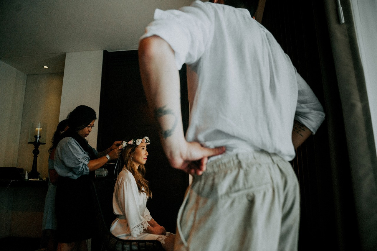 능숙한 Risma가 지시한 대로 남편의 치장이 먼저 시작되었다. 비치웨딩에 딱딱한 정장은 어울릴 것 같지 않아 흰색 리넨 셔츠와 밝은 아이보리 색 바지를 준비해왔다. 평소엔 스포티한 복장을 하는 남편은 처음에는 이 모든 드레스업 과정들을 어색해했지만 헤어와 메이크업까지 멋지게 완성되자 나름 마음에 들은 듯 자신의 모습을 이리저리 거울을 비춰보았다.