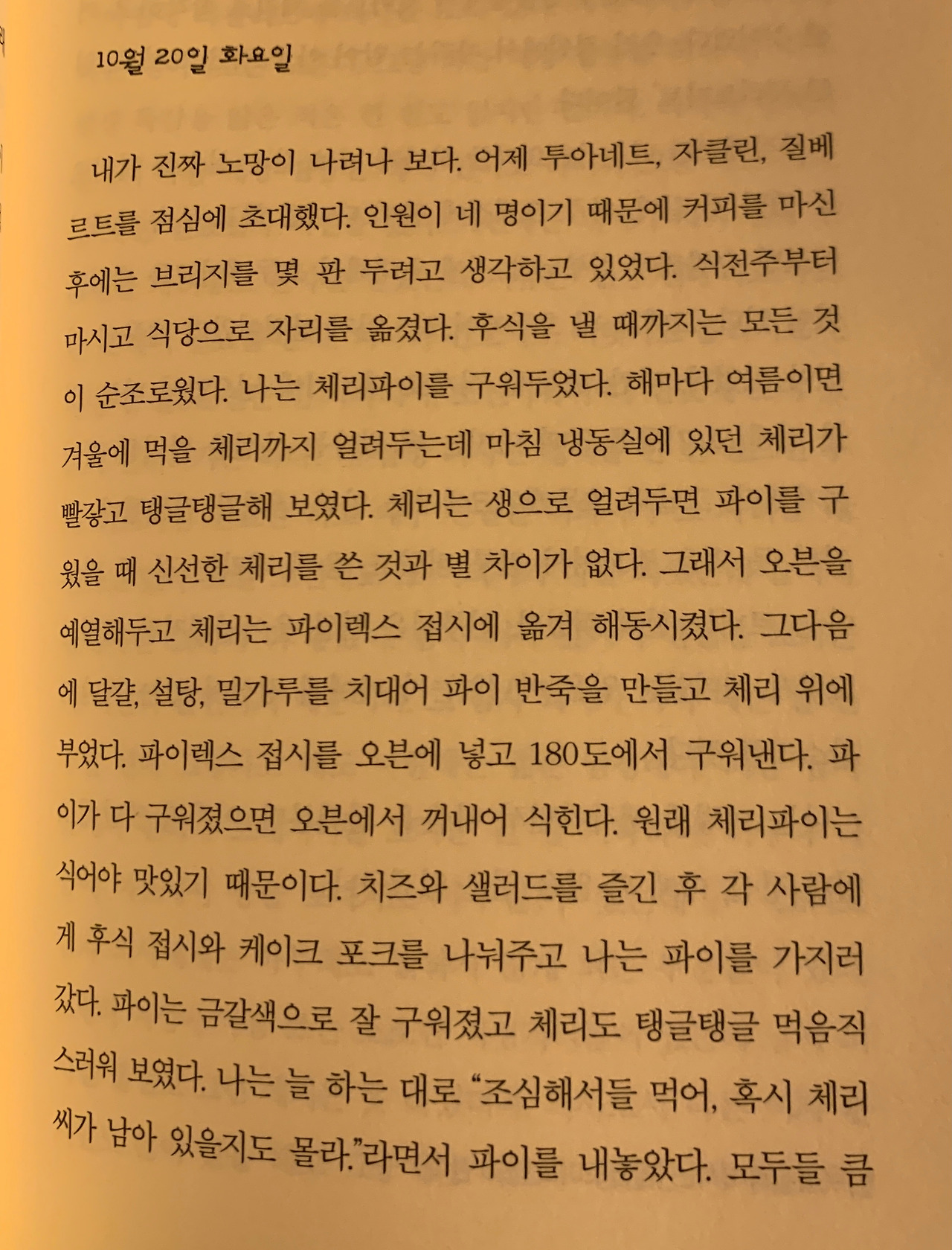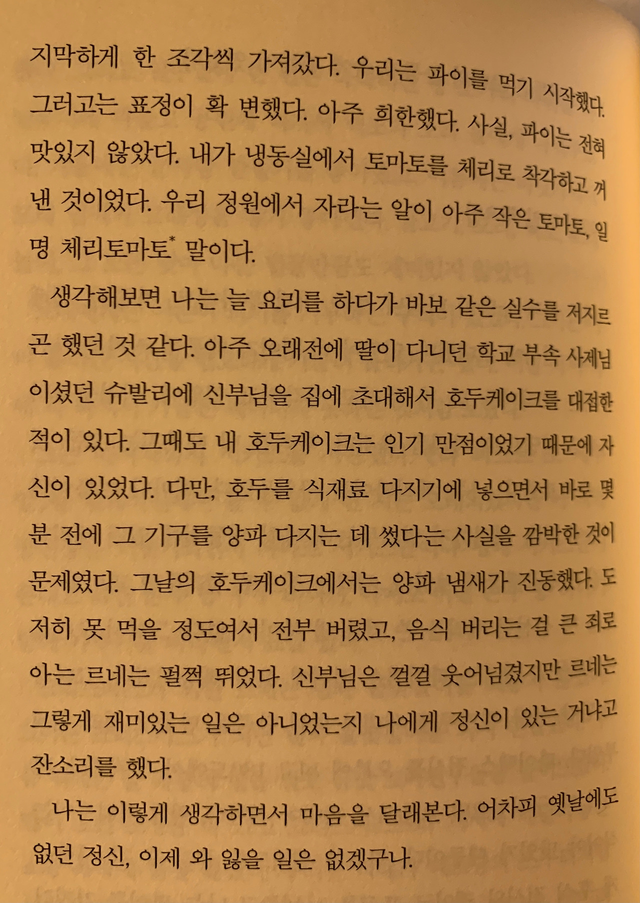 본문에 이 책의 제목이 된 '체리토마토파이'에 관련된 내용이 등장한다. 잔의 귀여운 실수가 나타난 내용이다. 이 책을 읽고 체리토마토가 방울토마토인 걸 처음 알았는데, 마지막 단락이 정말 명언이었다.