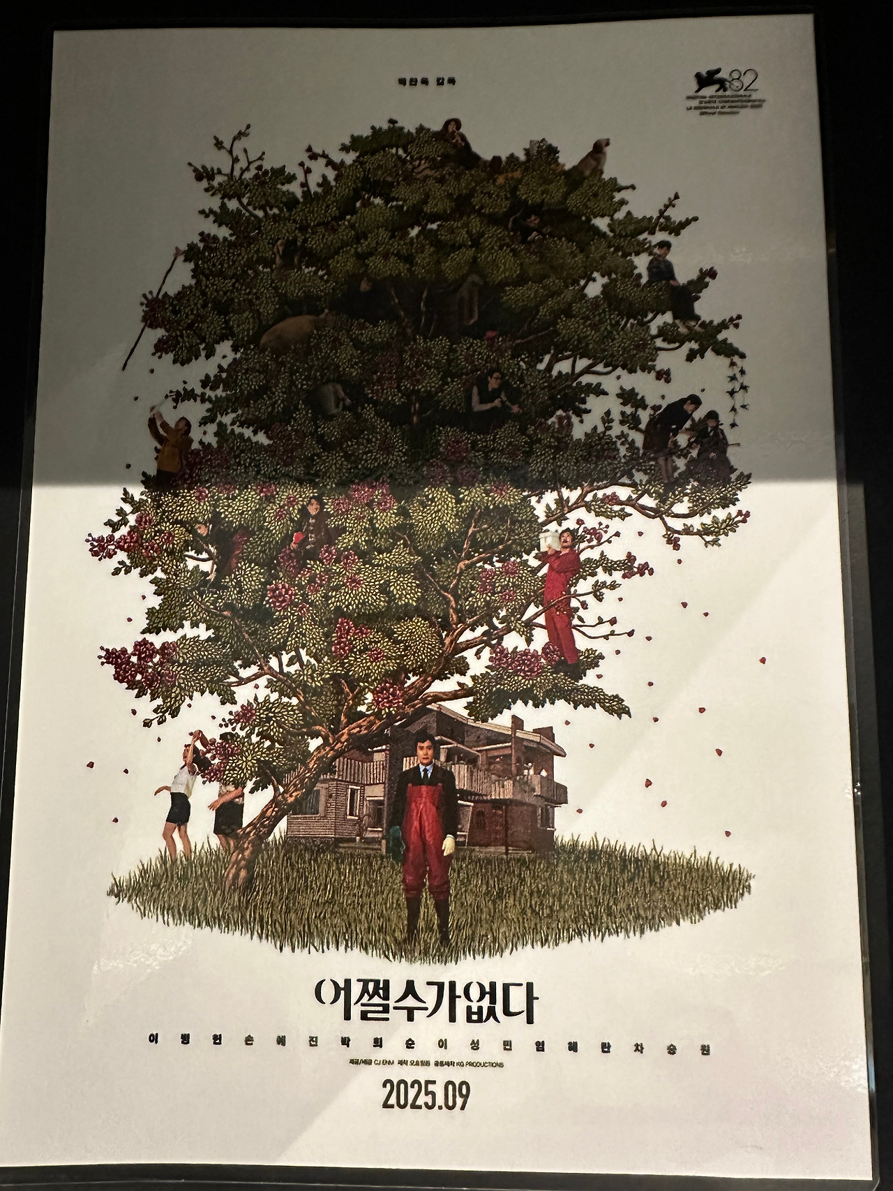 9월 한 달 내내 셰익스피어의 비극과 함께했다. 오늘은 박찬욱 감독의 문제작 “어쩔수가없다”를 함께 보기로 했다. 평소 모임에 맞춰 조조 영화를 예약했다. 가장 빠른 시간이 10시 30분이라니, 사람들이 정말 영화를 많이 보지 않는다는 현실을 체감할 수 있었다. 리클라이너 관이라 13,000원이었지만, 문체부에서 제공하는 할인권 덕에 7,000원에 볼 수 있었다. 더 좋은 소식은 이번 영화 관람은 회비로 충당한다는 사실이었다.
