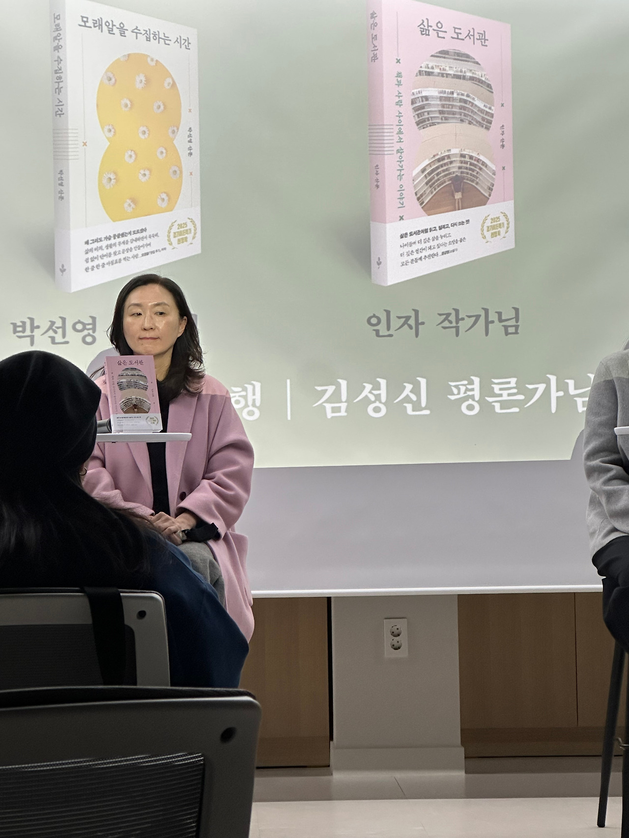 인자 작가의 신간 『삶은 도서관』을 주문하고 기다리다 반가운 소식을 들었다. 경기‘히든’작가 선정작 기념 책이야기마당이 시청역 근처 알라딘 빌딩에서 열린다고 했다. 선착순 20명이라기에 고민할 틈도 없이 신청 버튼을 눌렀다. 막상 날짜가 다가오고 또 갑자기 추위가 닥치자 집을 나설까 말까 한참 망설였다. 하지만 그녀를 만날 생각을 하니 ‘귀차니즘’은 저만치 떨쳐버릴 수 있었다.