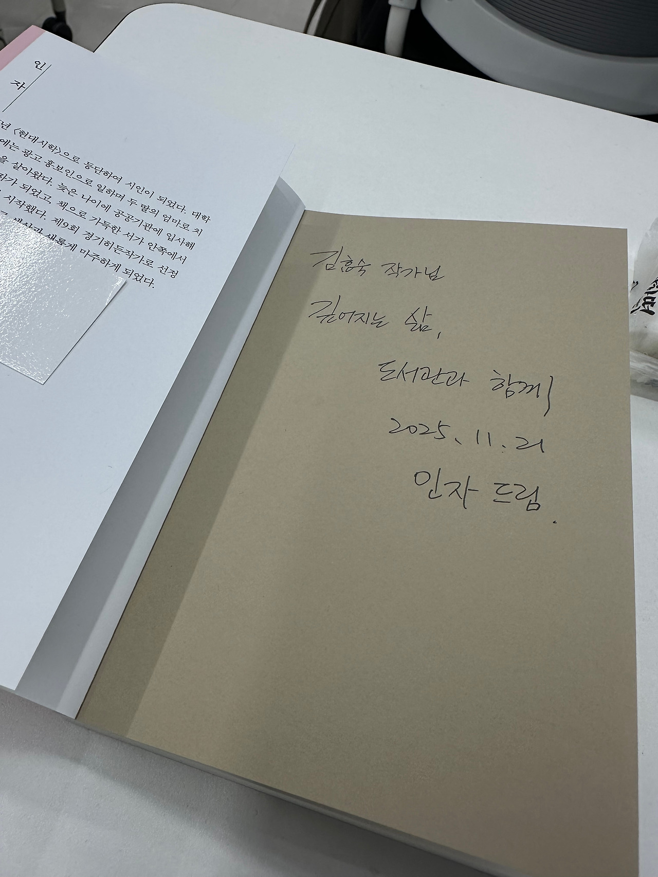 문을 열고 들어서니 입구에 정갈하게 간식과 책갈피가 가지런히 놓여 있었다. 떡과 귤을 챙기고 인자 작가의 책을 알리는 책갈피를 하나 골라 들었다. 앞쪽에는 커다란 스크린이 보이고 탁자와 의자가 줄지어 있었다. 자리를 잡으려는데 책 표지와 색을 맞춘 듯 분홍빛 코트를 입은 인자 작가가 반겨 주었다. 행사가 시작되기 전에 미리 작가의 사인을 받았다. 한 자 한 자 정성껏 눌러쓴 문구에 가슴이 뭉클했다.