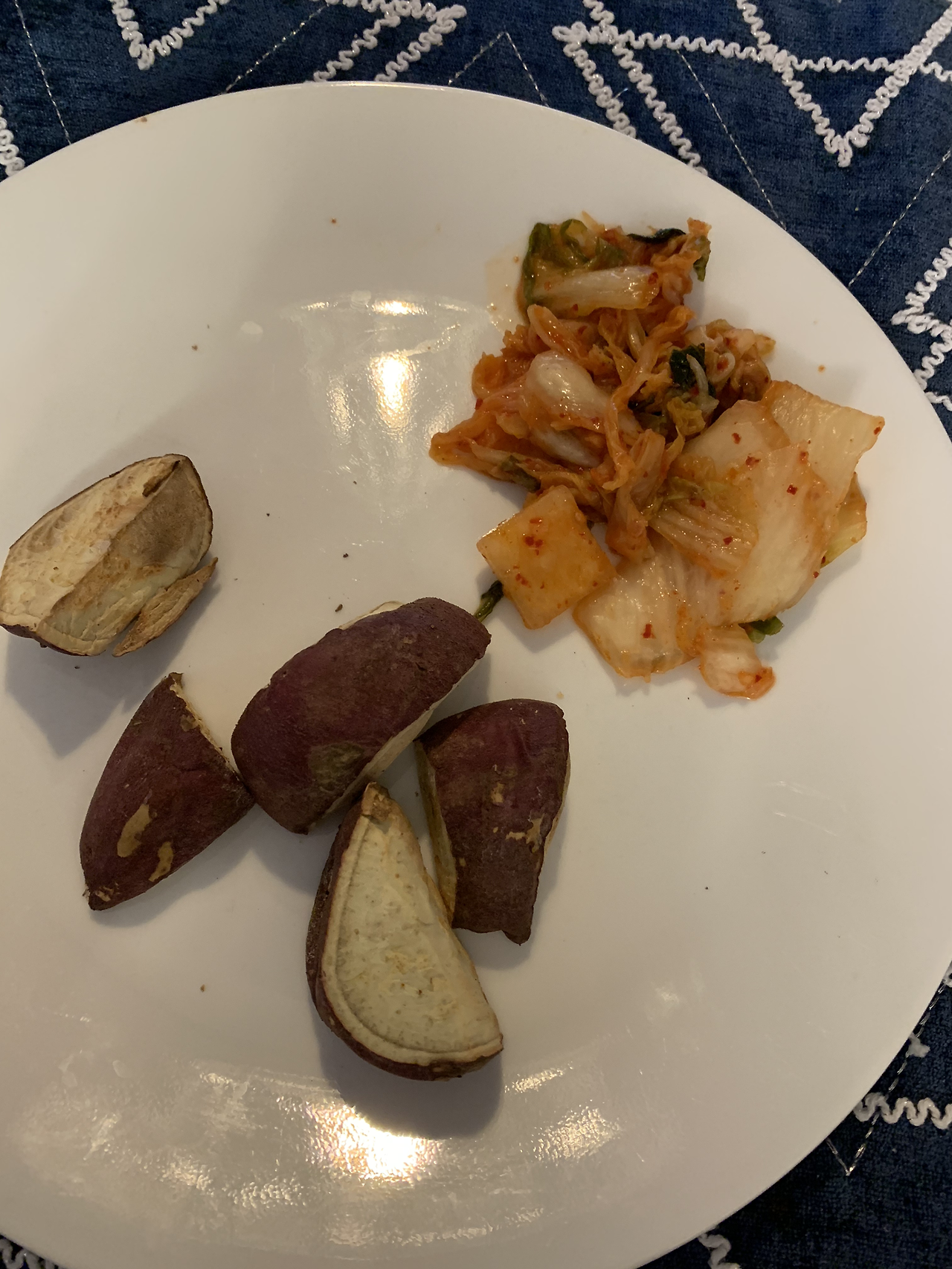 간식으로는 군고구마와 김치. 고구마는 에어프라이어에 돌렸다. 통으로 돌렸으면 더 맛있어 보였겠지만 빨리 익으라고 그냥 잘라서 넣었다. 사실 플레이팅에는 관심이 없다.