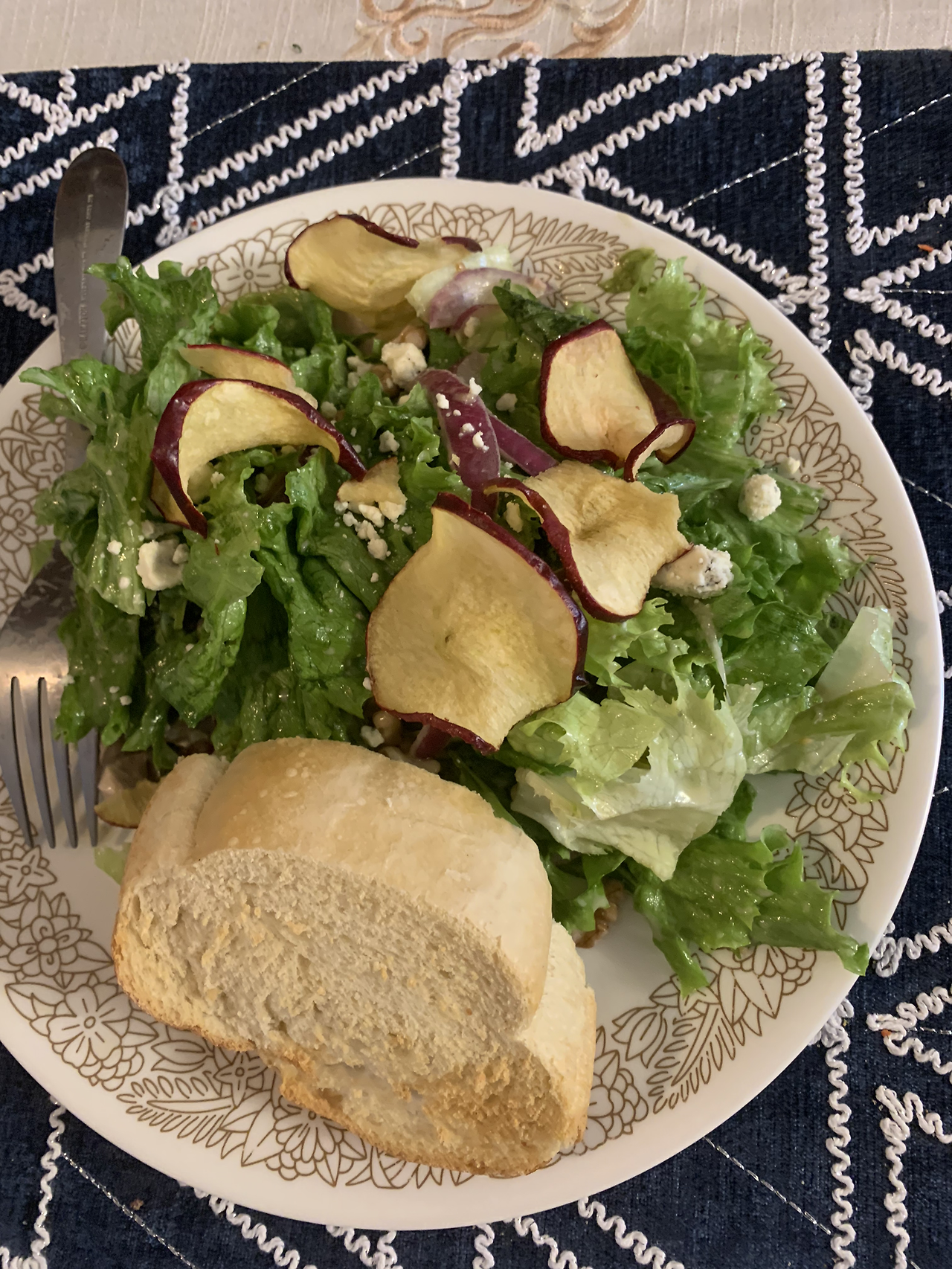 점심은 마찬가지로 남은 샐러드(+상추, 애플칩 추가)에 빵 먹었다. 빵 에어프라이어에 5분만 돌리면 바삭하고 따뜻하고 엄청 맛있어진다.