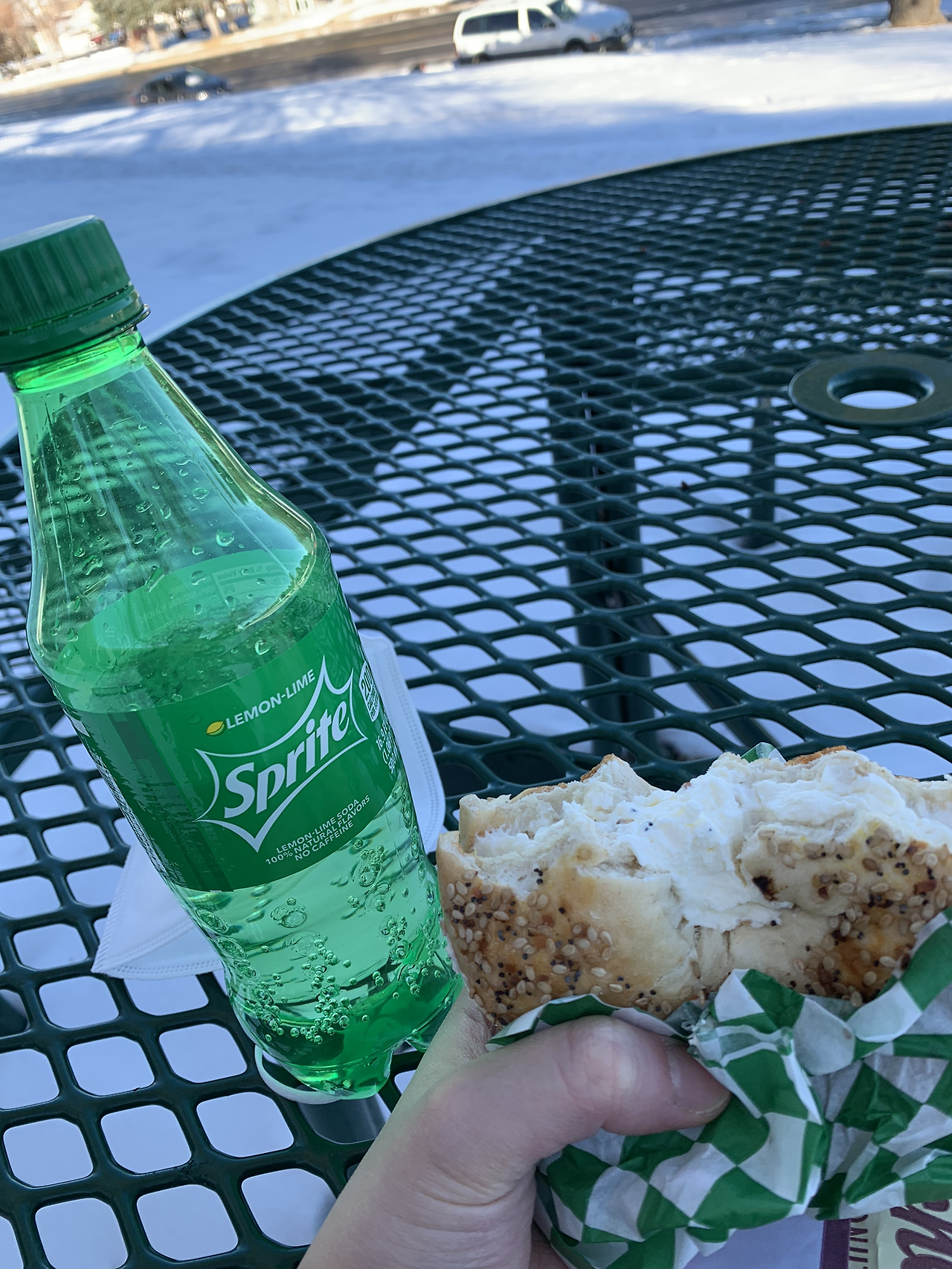 자세히 이야기하면 구구절절 너무 길어지니까 그냥 갑작스럽게 내 컴퓨터를 가지고 어딘가로 가게 되었다고 하겠다. 그래서 일을 보는 와중에 배가 너무 고파서,, 근처 아무 데나 들어가서 베이글과 사이다를 사 먹었다.