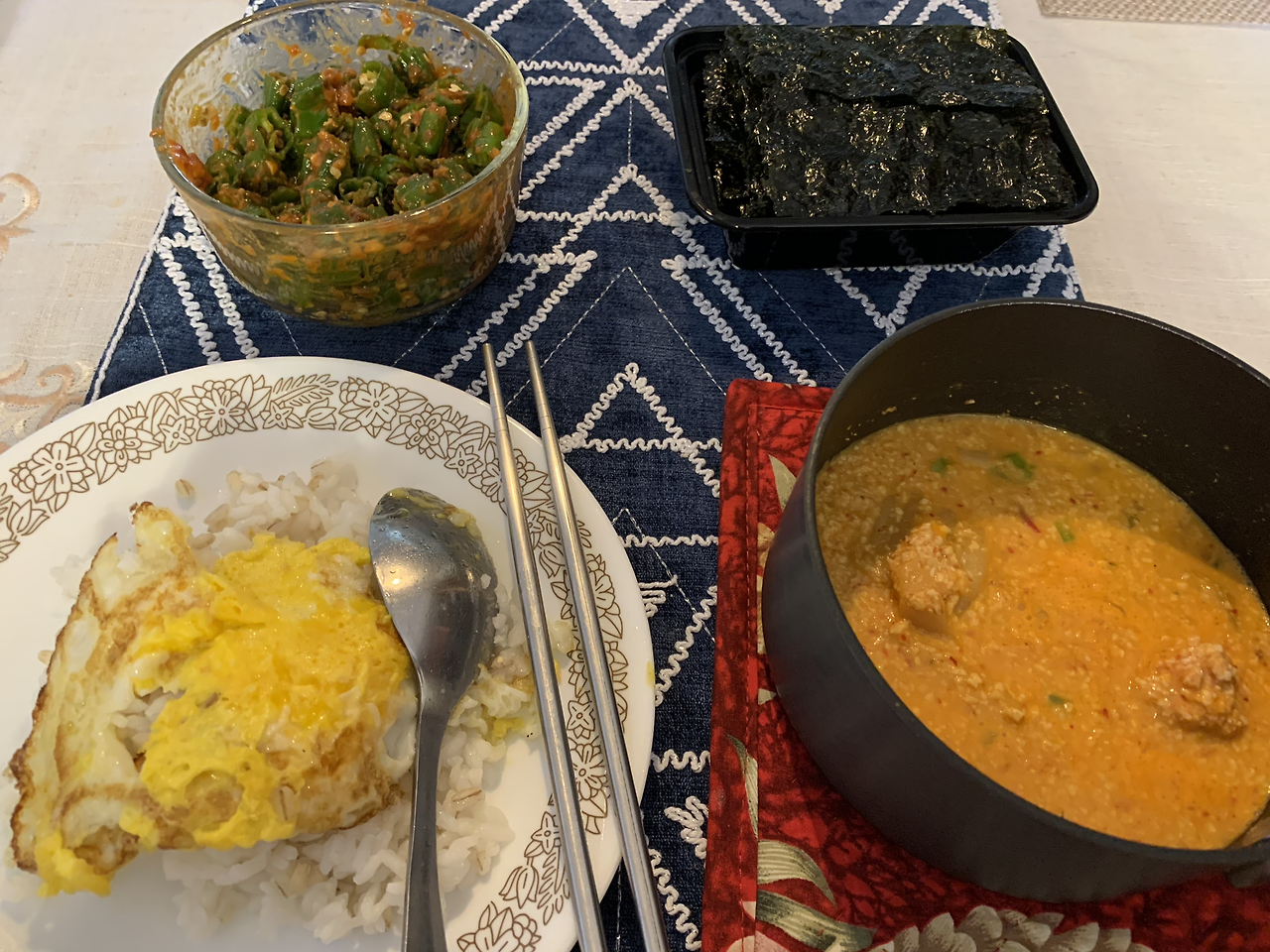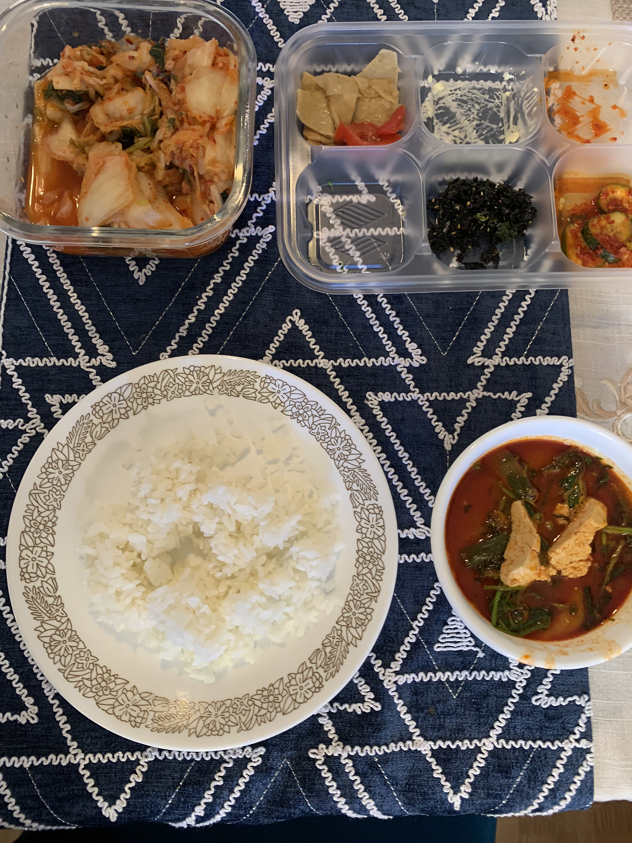점심으로는 밥 계란 프라이 김 꽈리고추무침 그리고 비지찌개를 먹었다. 비지찌개는 샀고 꽈리고추무침은 만들었다. 저번에 먹은 것보다 많이 매워서 당황스럽지만 그래도 맛있게 먹었다.
