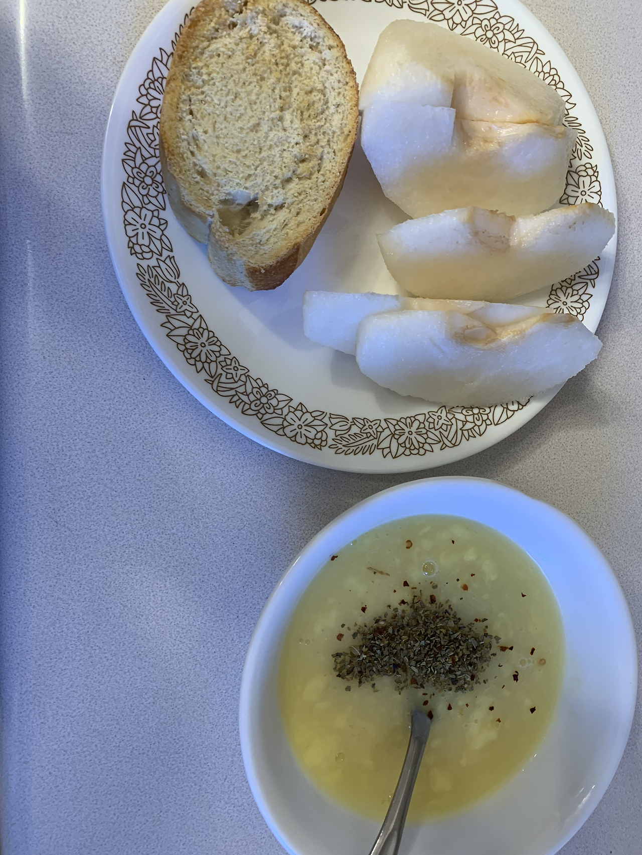 아침으로 빵과 옥수수 수프 그리고 배. 배는 어제 갈비찜 소스에 반 갈아 넣고 반 남은걸 잘랐다. 과일 껍질을 못 벗겨서 독립 후 키위, 귤, 포도 같은 과일만 먹었는데 감자칼로도 과일 껍질 잘 벗겨진다. 21세기의 기술력에 감사한다.