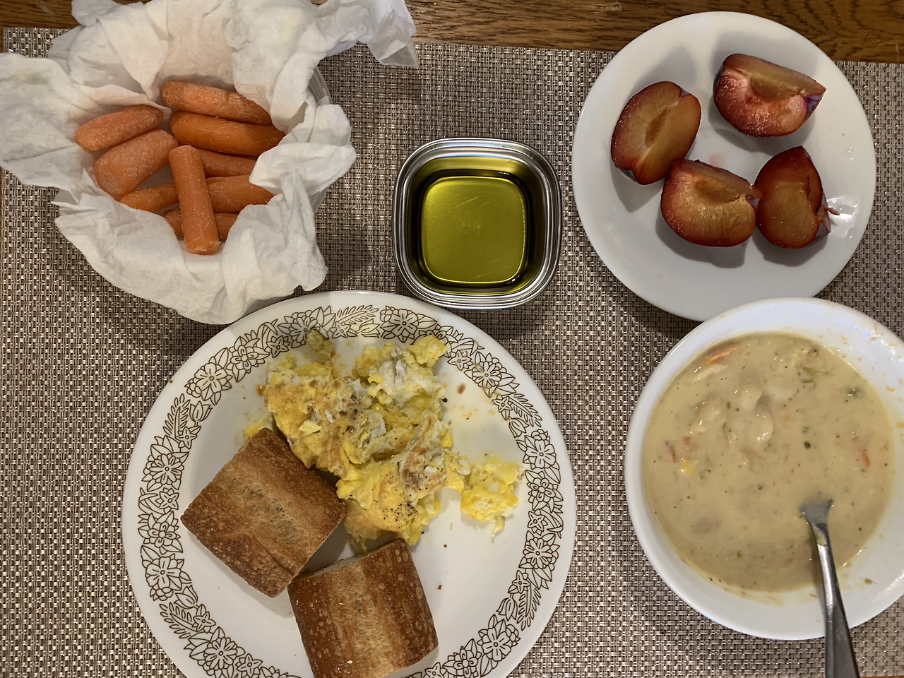 저녁도 한상 가득 차려 먹었다. 어제와 구성은 동일하고 오늘은 치킨 팟 파이 캔 수프를 먹었다. 자두로 디저트.