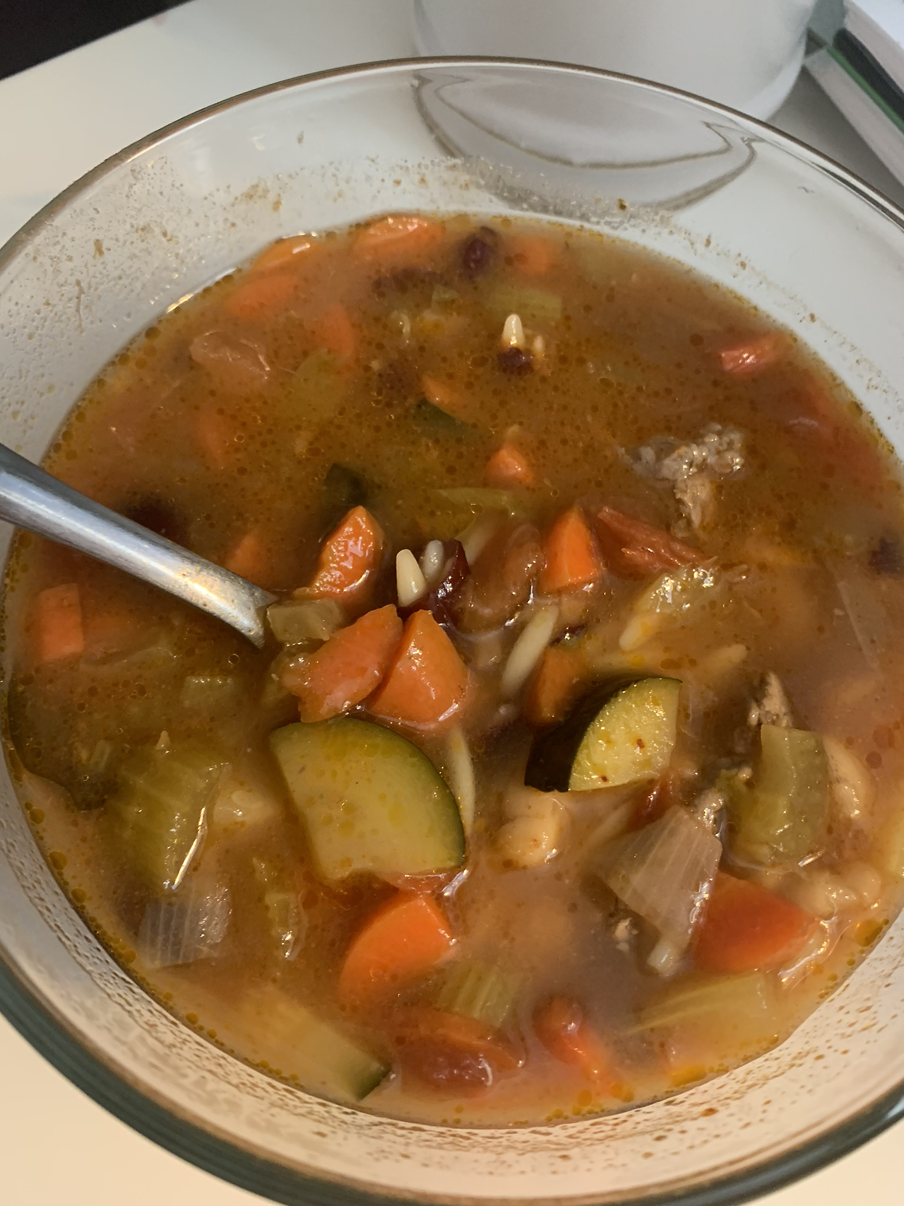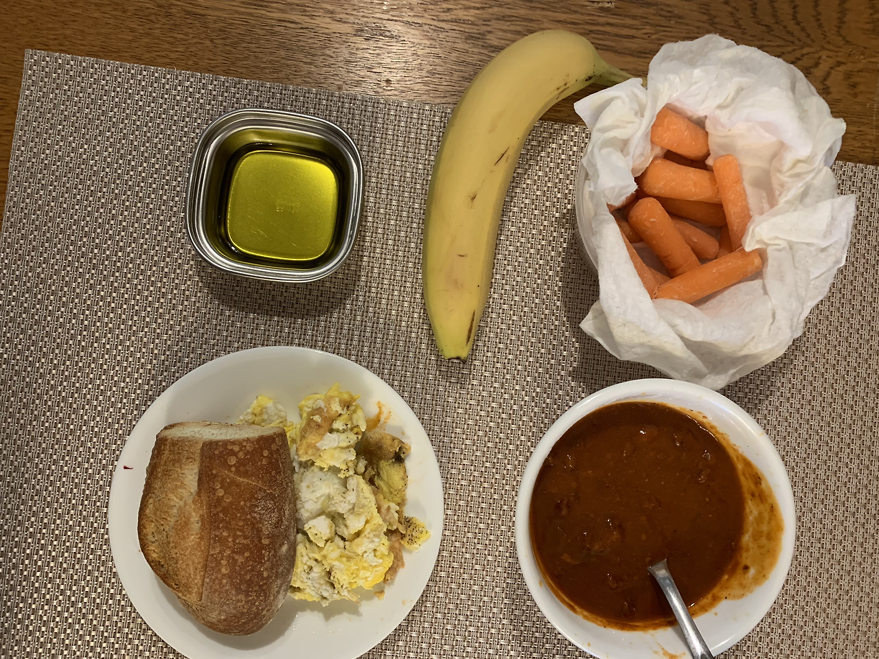 퇴근하고 집에 와서 간단한 저녁을 먹었다. 저번 주에 월요일에 비행기 타고 집에 오면 장 볼 기력이 없을 것 같아서 통조림 수프를 잔뜩 사놓았다. 오늘 먹은 건 토마토 베이스의 칠리다. 빵은 리쿠르팅 가서 받아온 바게트 소분해서 냉동해둔 것을 에어프라이어에 돌렸다. 올리브유 찍어 먹으면 맛있다.